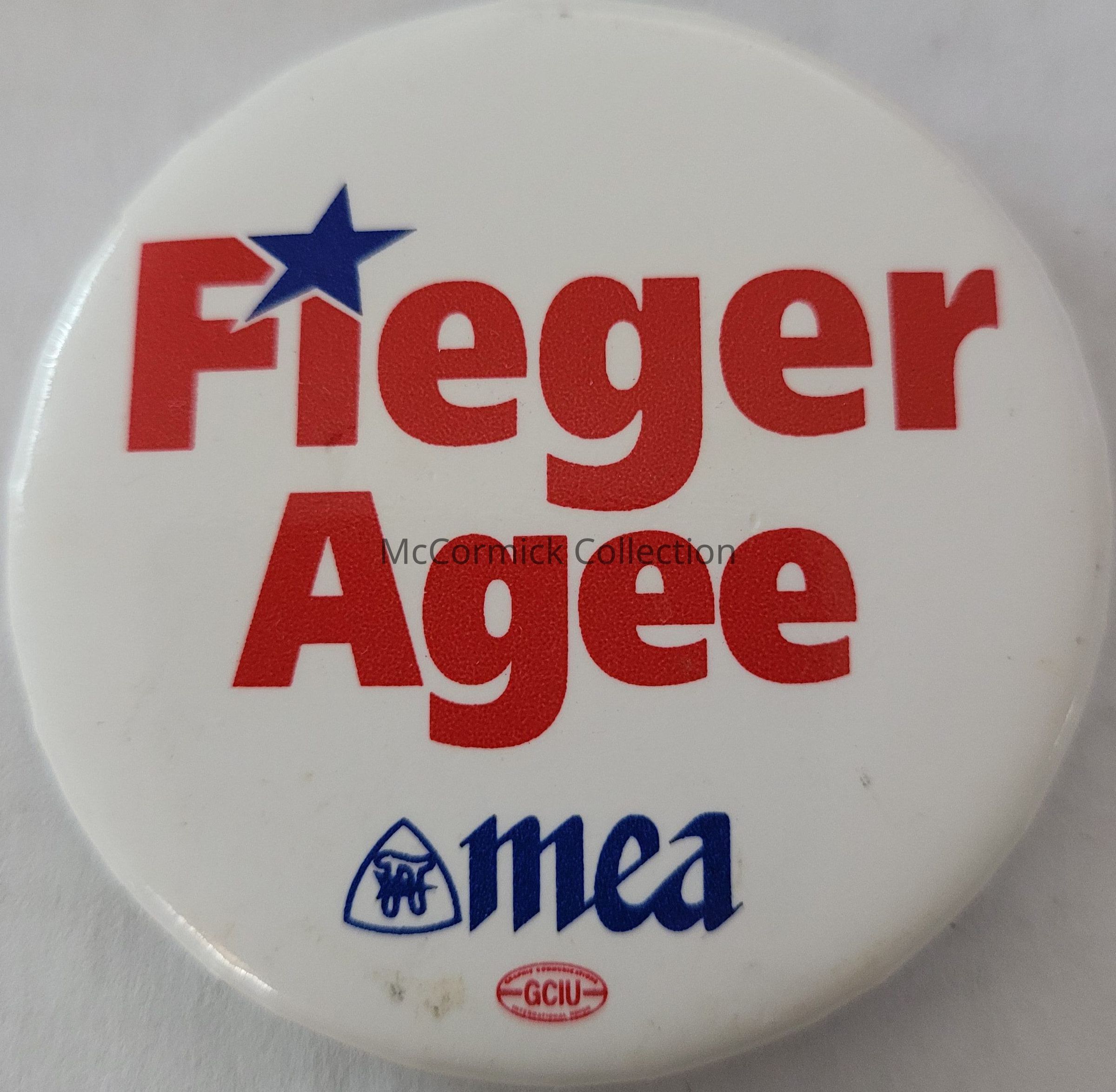 A 2.25" red, white, and blue political button for Geoffrey Fieger for Governor, distributed by the Michigan Education Association, circa 1998.