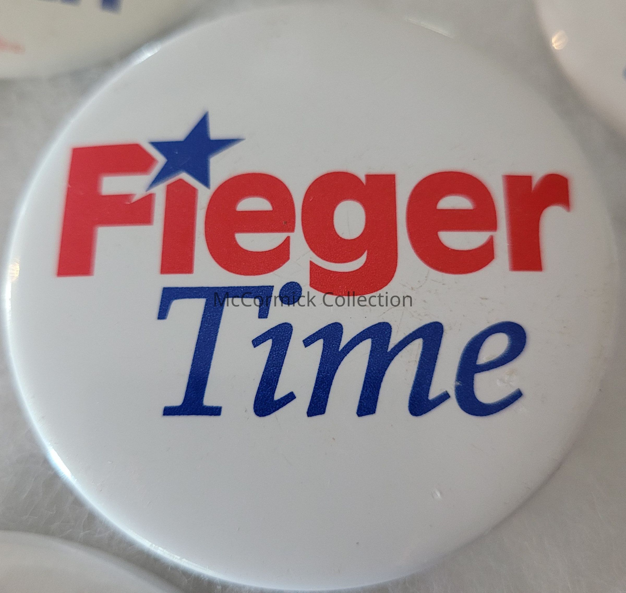 Political button, red, white, and blue, for Geoffrey Fieger for Governor, 1998. Kingdon Collection.