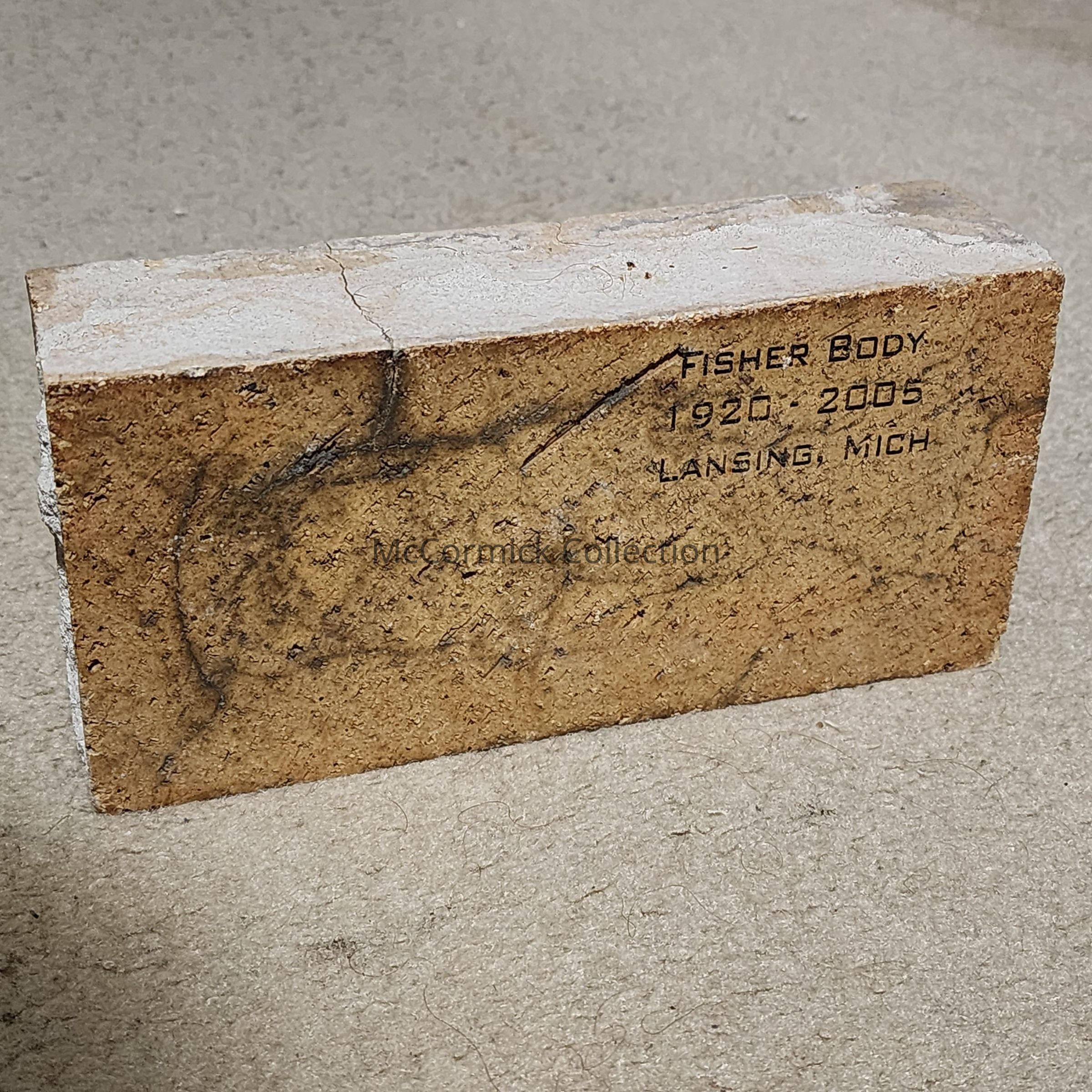 Brick from the demolished Fisher Body plant on Lansing's westside. The plant was originally Durant Motors, built in 1920. It was demolished in 2005. These bricks were souvenired out. Have a few.
