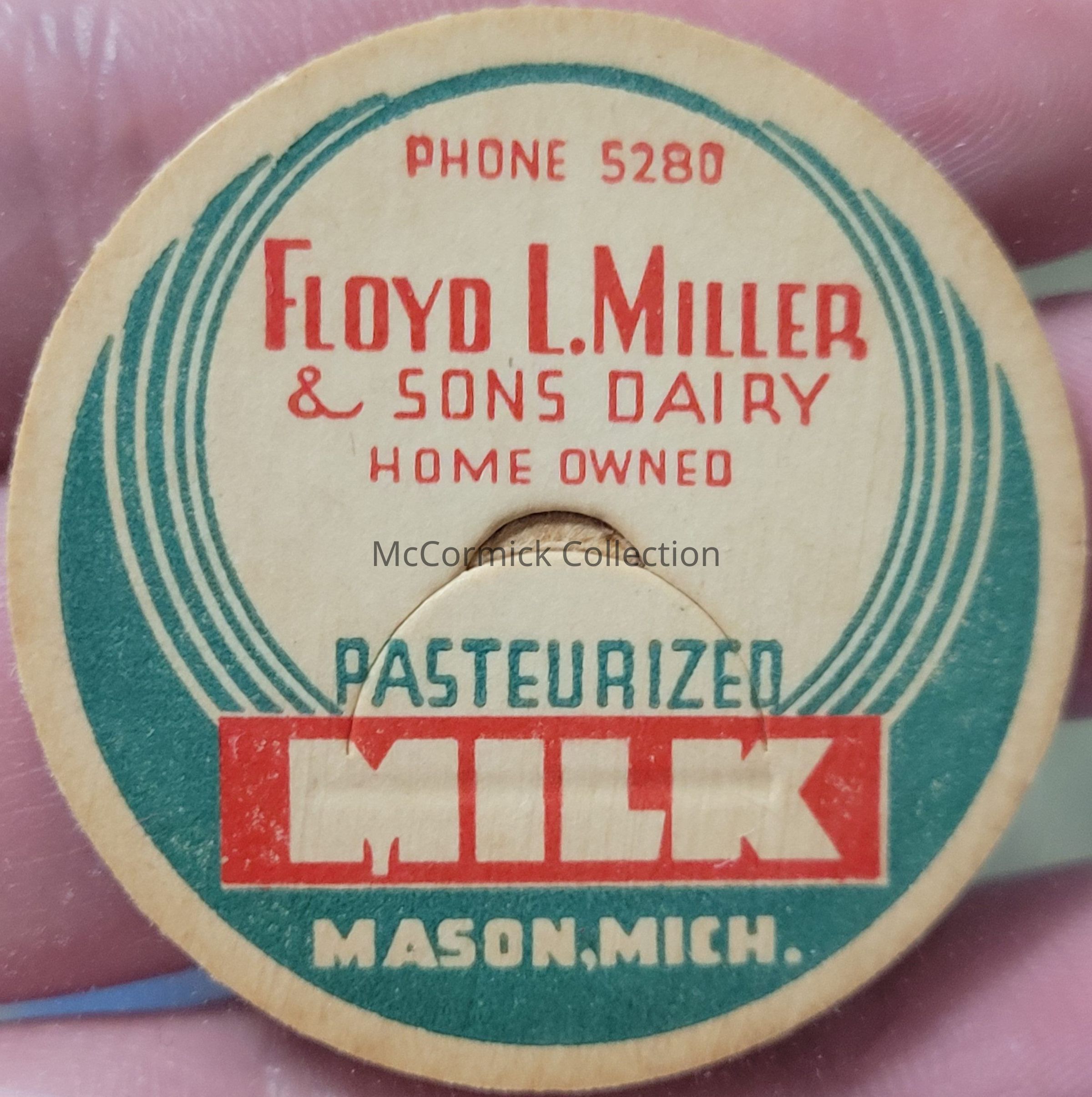 A paper/cardboard cap or lid from the Floyd L. Miller & Sons Dairy of Mason, Michigan, for Pasteurized Milk.