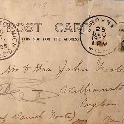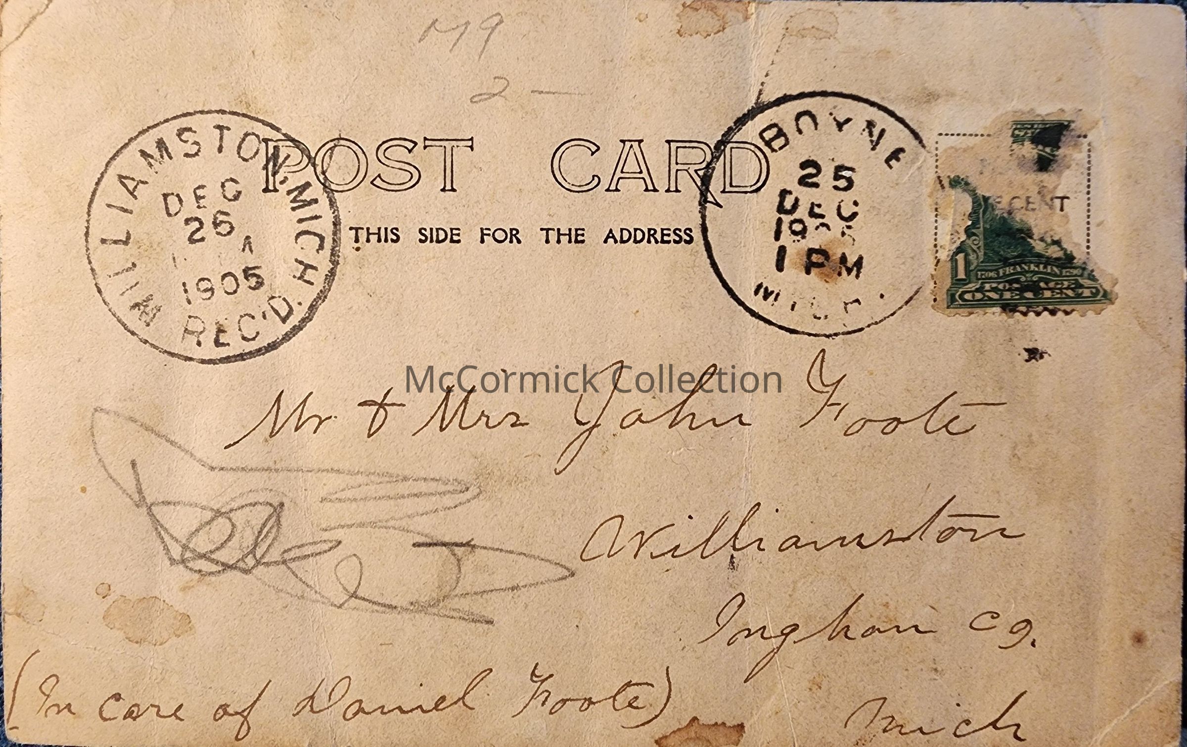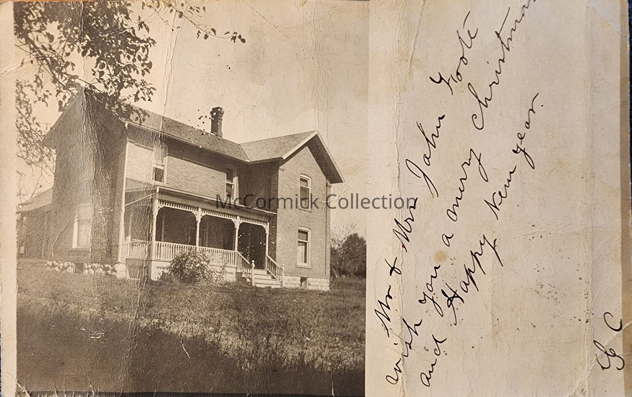 Real photo postcard of a farmhouse captioned "Mr. and Mrs. John Foote wish you a merry christmas and happy new year." Possibly showing the Foote farm, possibly showing a Boyne, Michigan, house. Postmarked Boyne 1905.