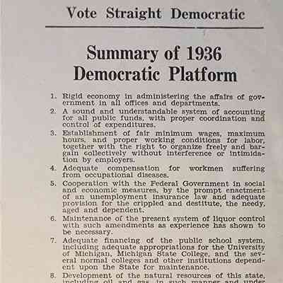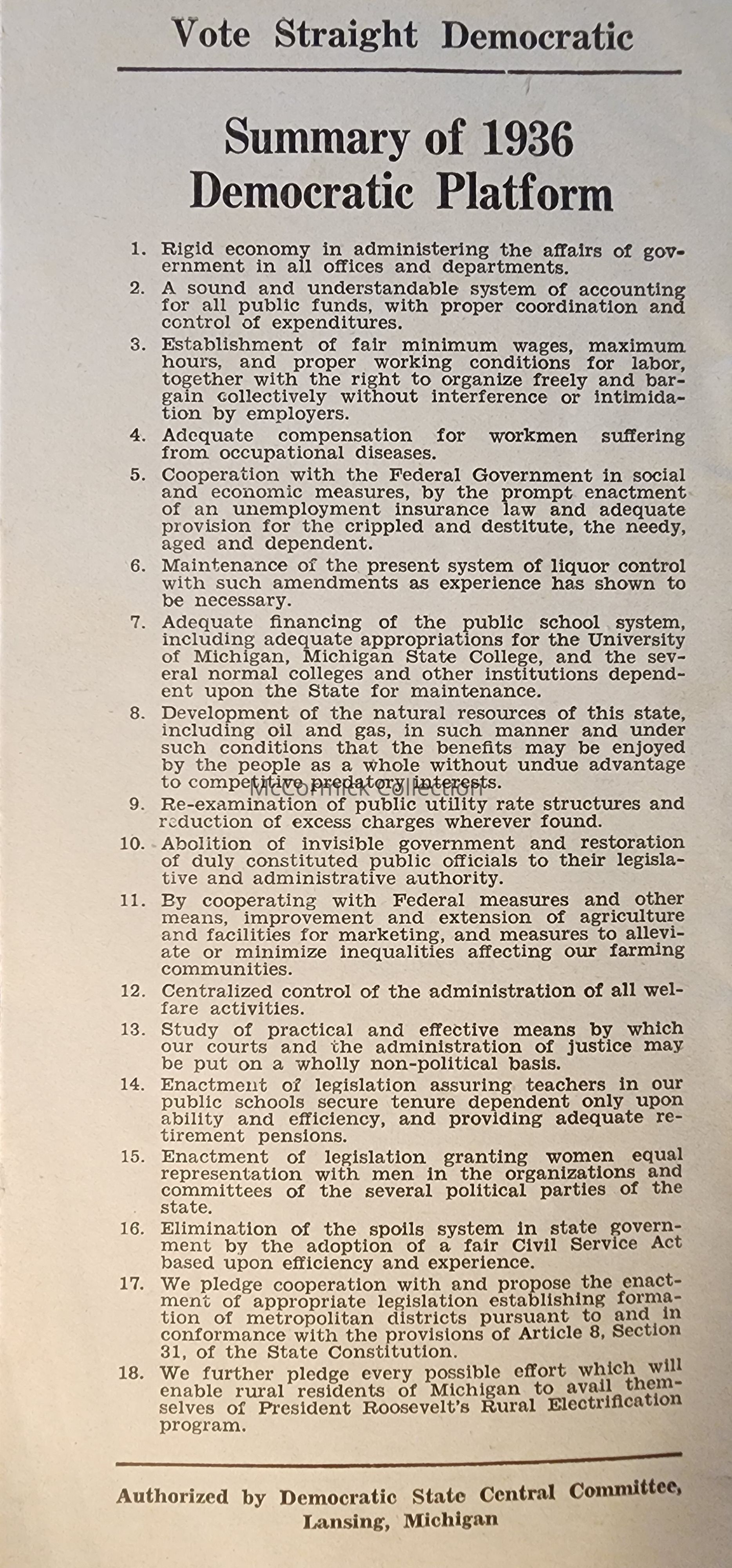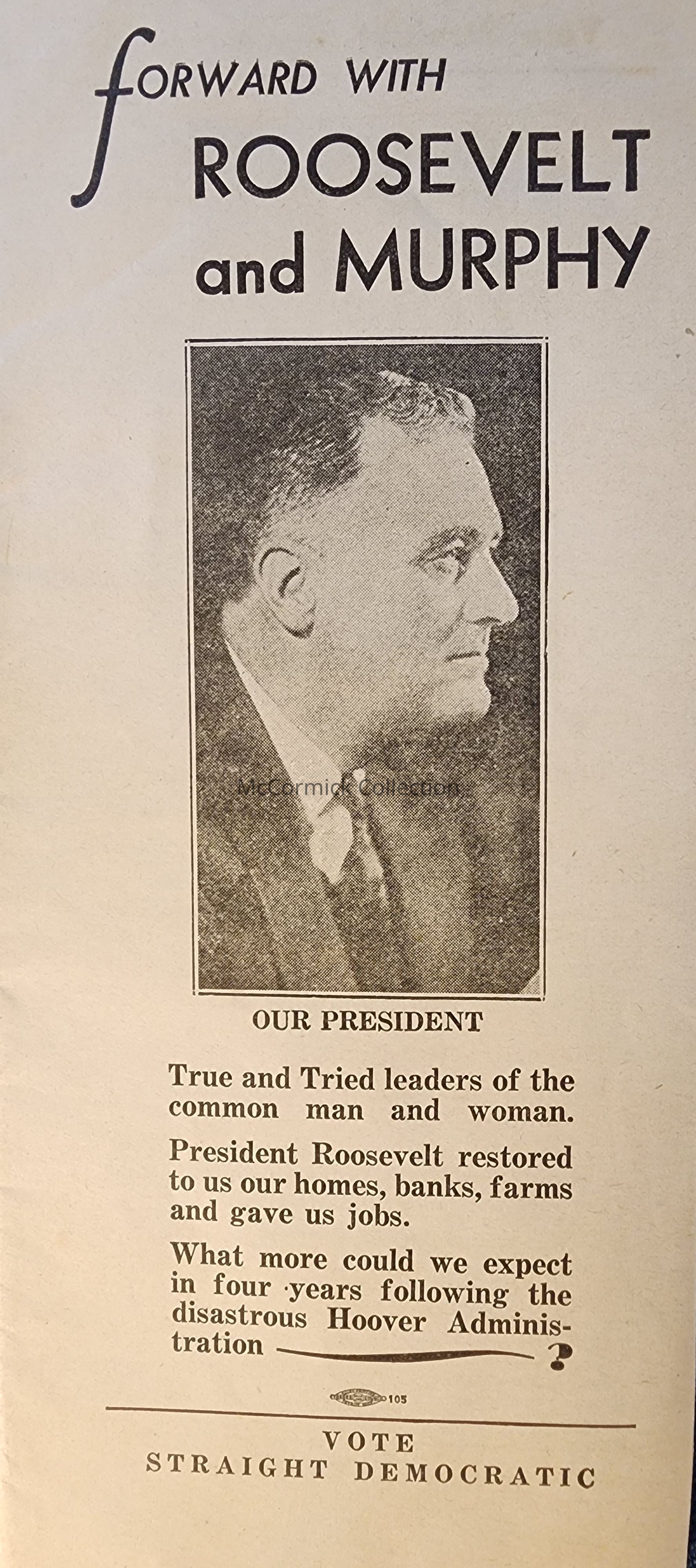 Published by the Democratic State Central Committee, Lansing, 1936. Support of Governor Frank Murphy.