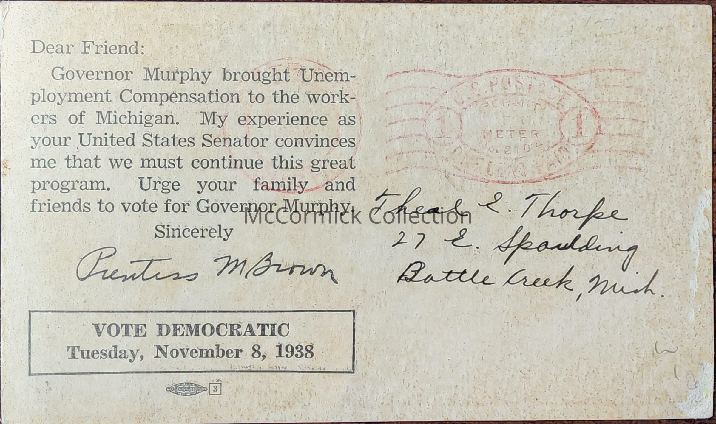 A 1938 political campaign postcard for Frank Murphy for Governor. Sent by Sen. Prentiss Brown supporting Murphy.