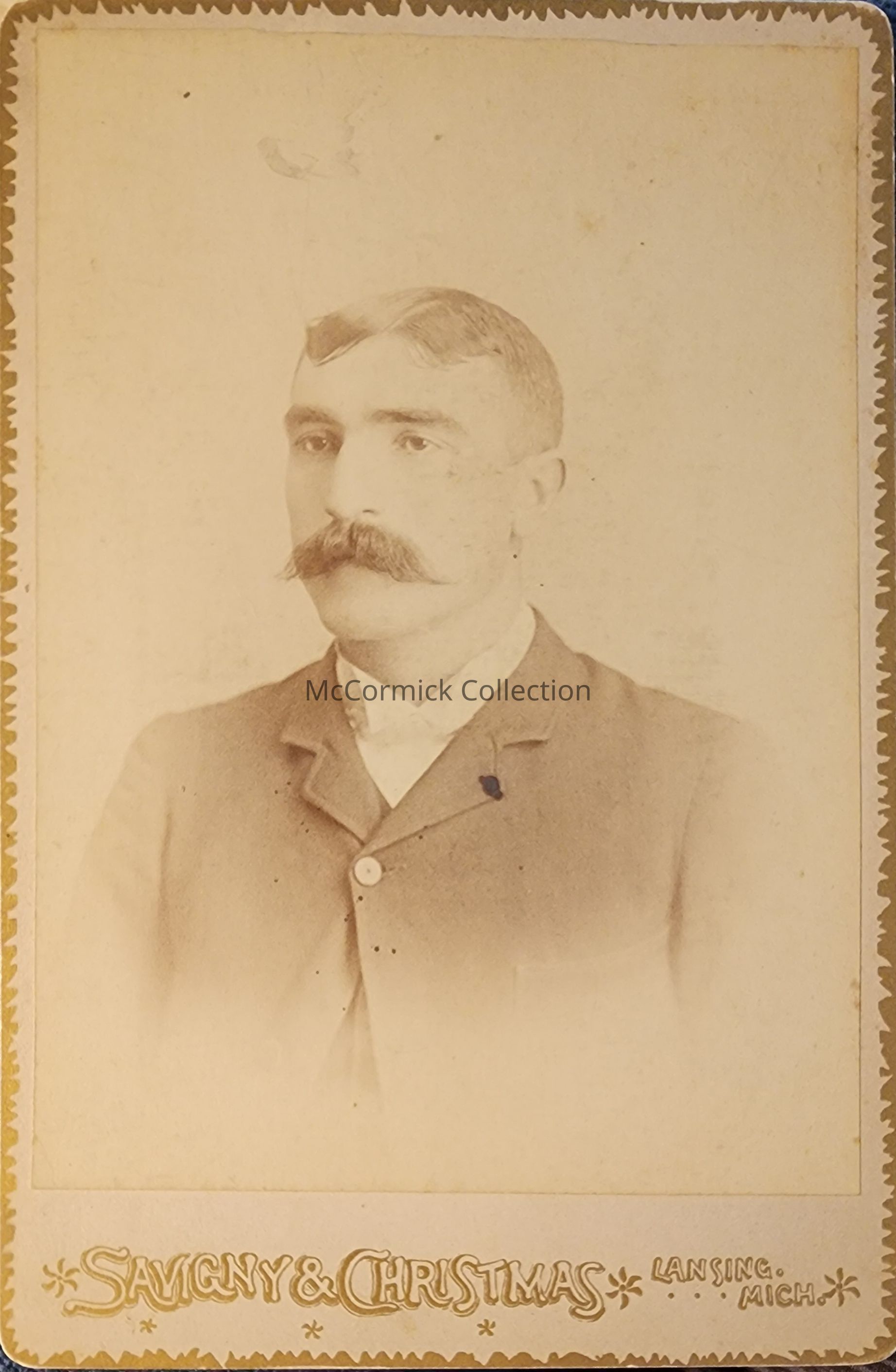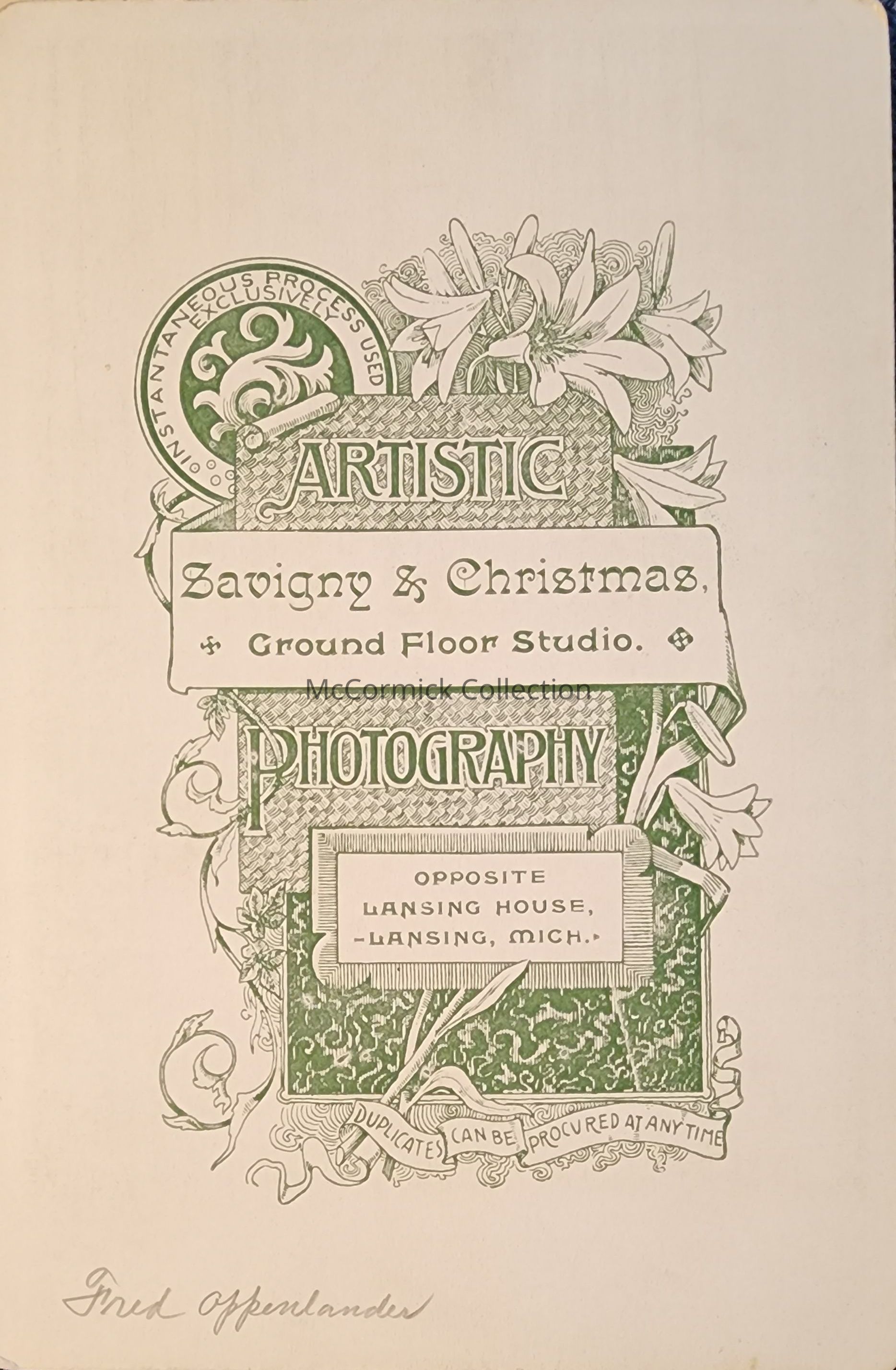Cabinet card photograph of Fred Oppenlander by Lansing photographer Savigny and Christmas.