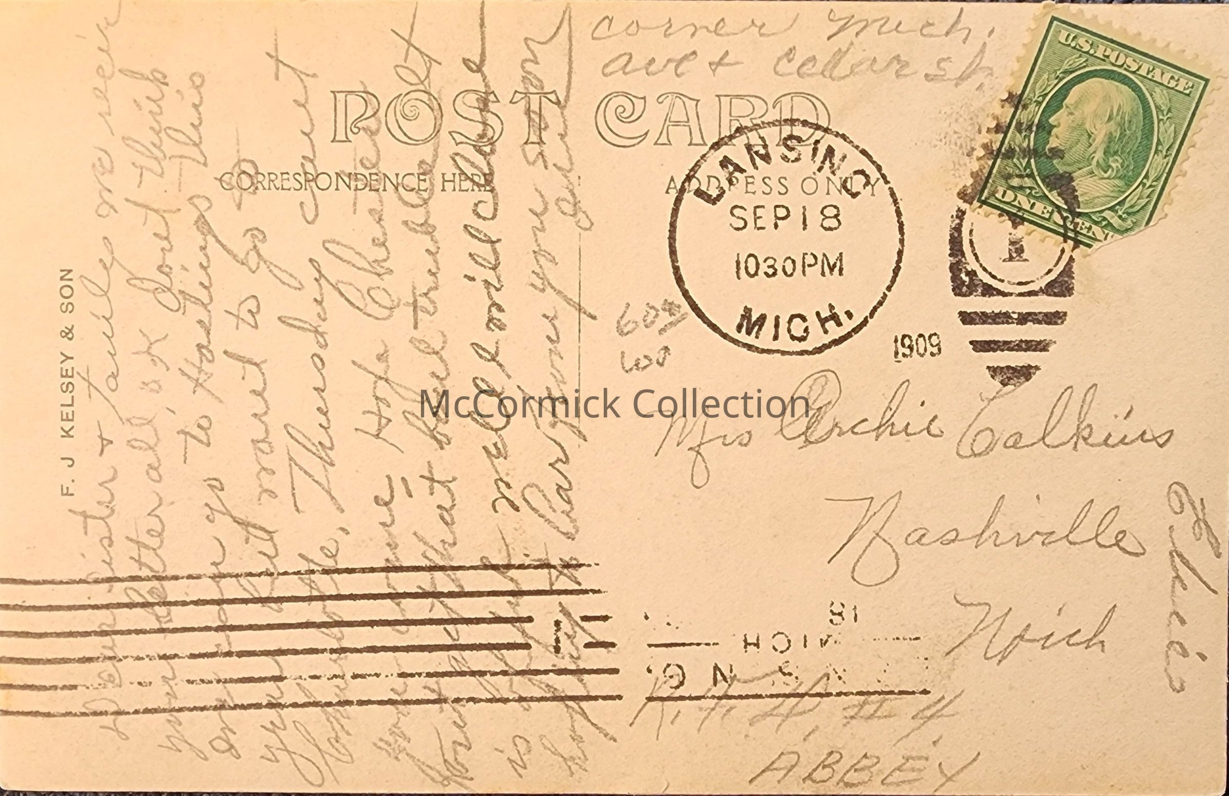 Back is stamped "F.J. Kelsey & Son." Postally used, Lansing 1909 postmark.