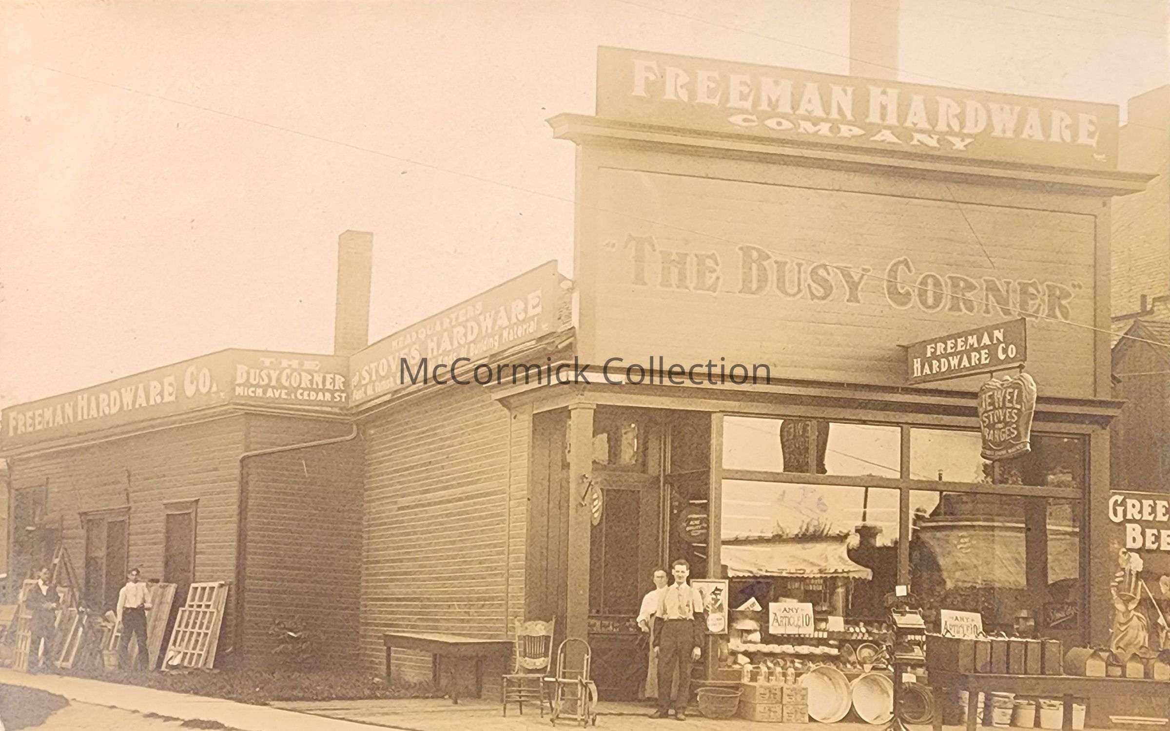 Real photo postcard of the Freeman Hardware Company of Lansing, Michigan. The building shows signage reading "the busy corner," "Mich. Ave. & Cedar St.," "Headquarters for Stoves and Hardware..." A sign for Jewel Stoves and Ranges hangs on the front of the building. Pictured are people, likely business owners and employees.
