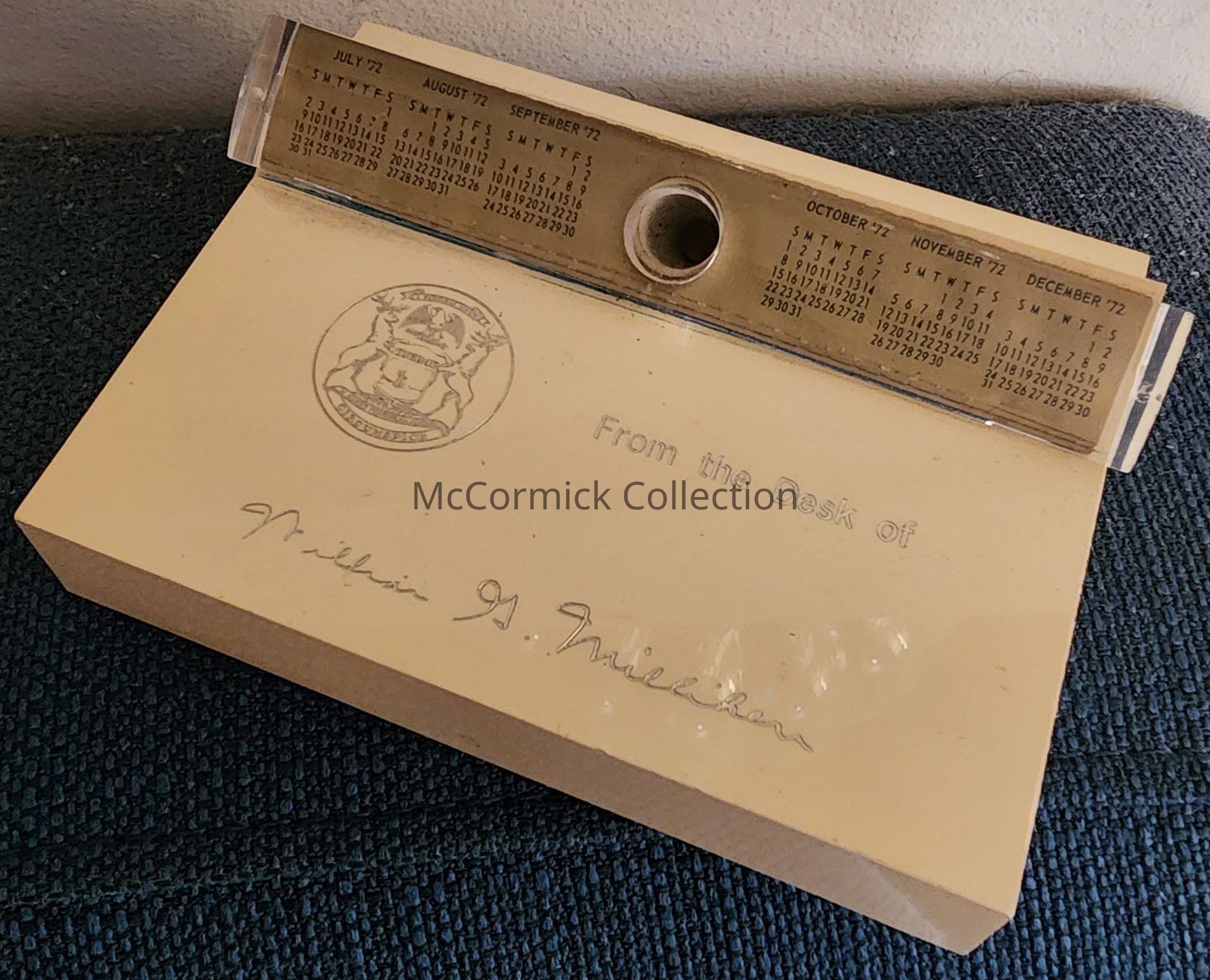 A white 1972 pen holder and calendar from the desk of Michigan governor William G. Milliken.