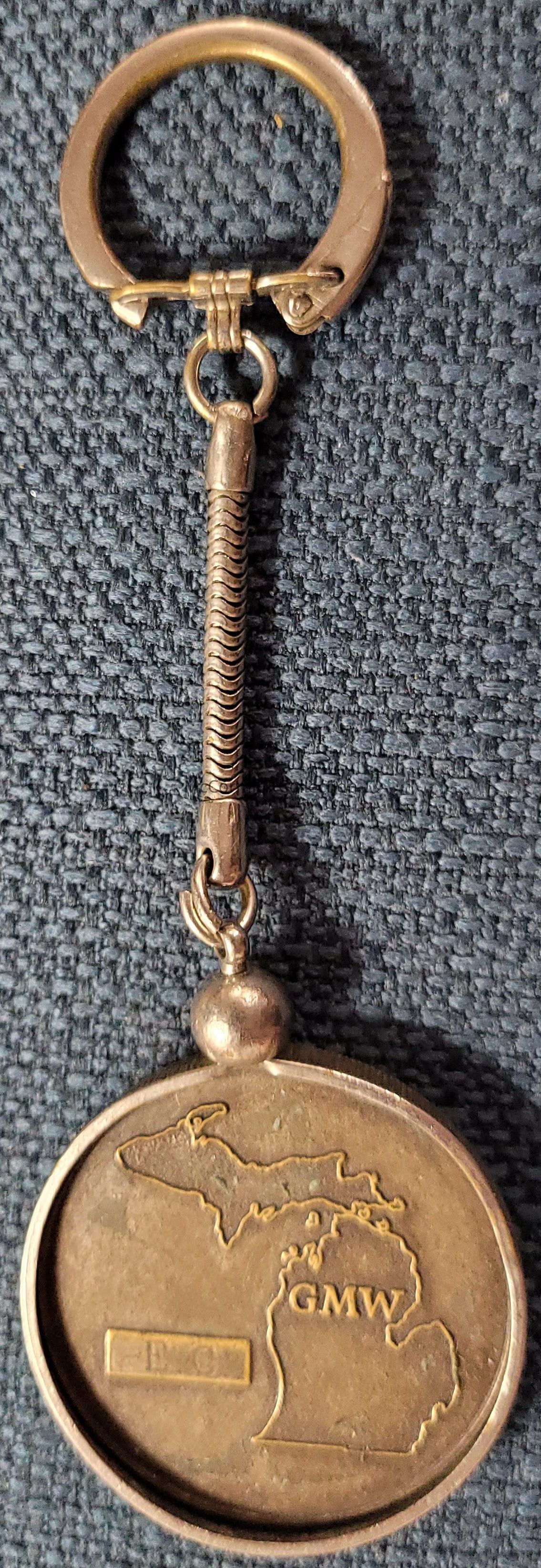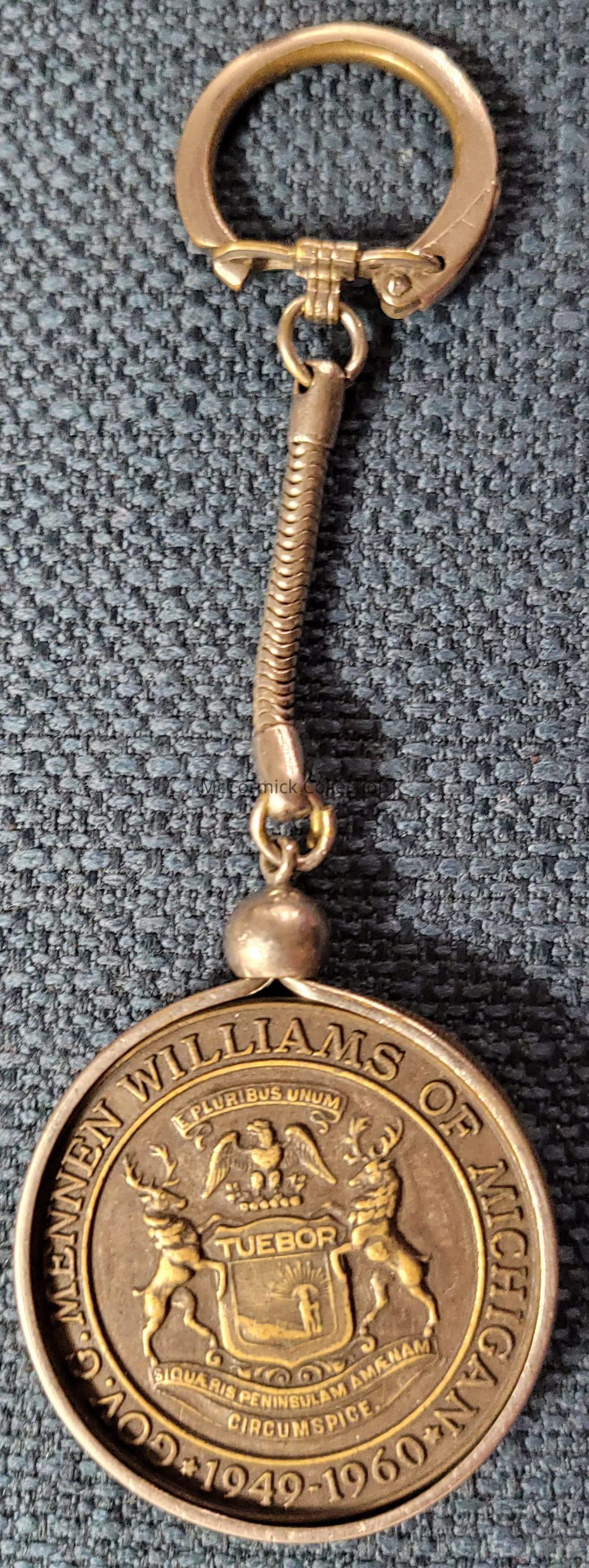 A challenge coin made into a keychain. From the end of the terms of Governor G. Mennen Williams of Michigan. Presented to someone with the initials E.C. Circa 1960.