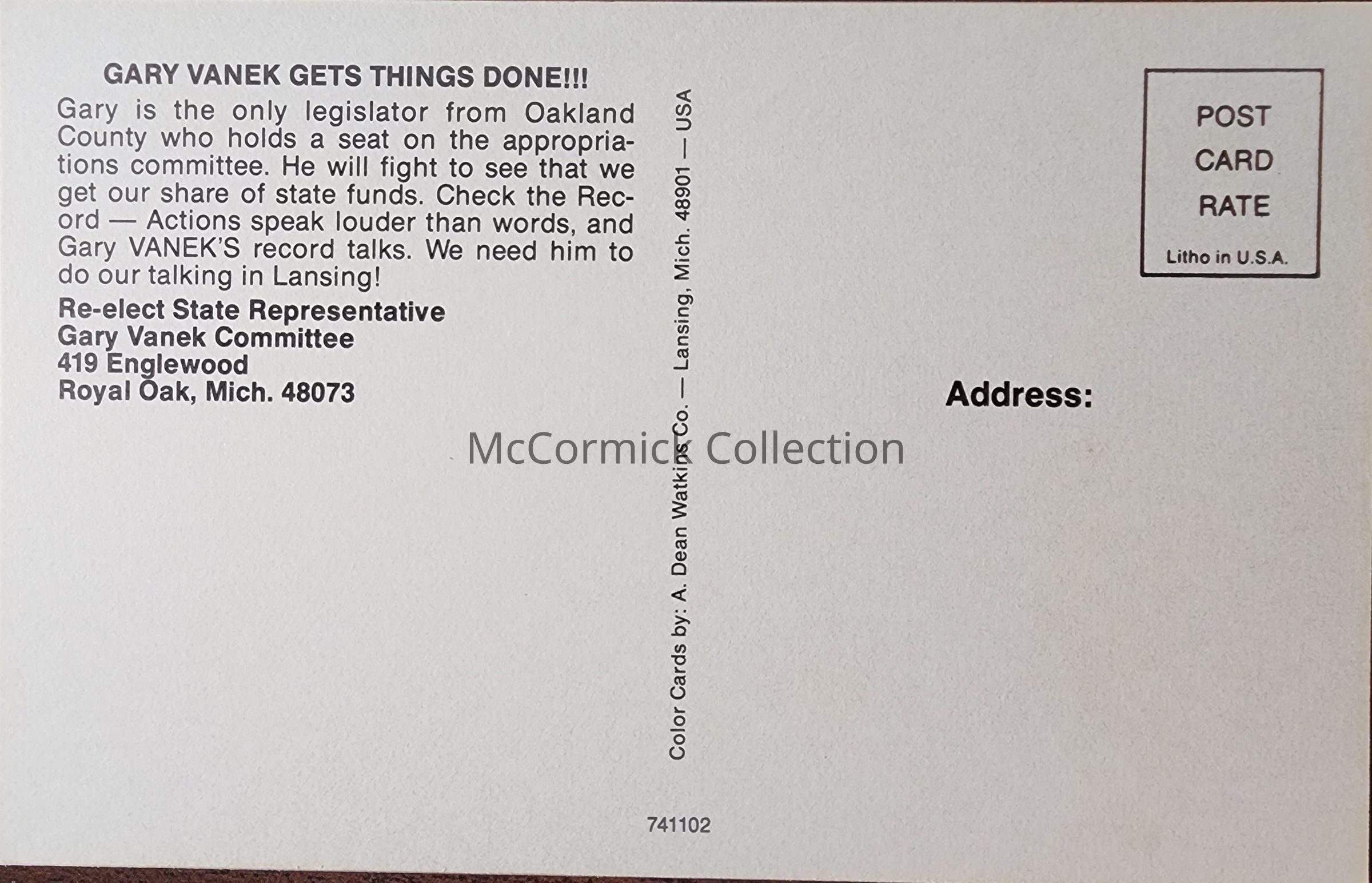 Gary Vanek State Representative Postcard