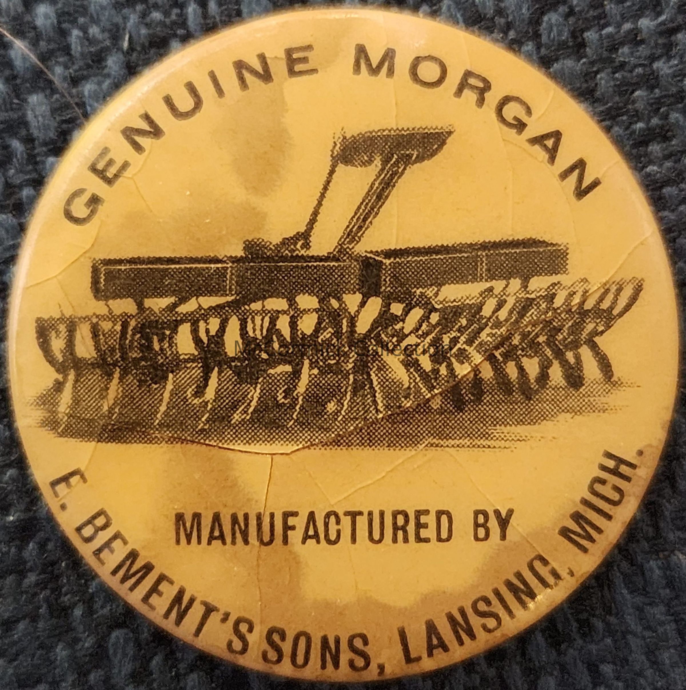 Genuine Morgan, Manufactured by E. Bement's Sons, Lansing, Mich. button. Missing pin.