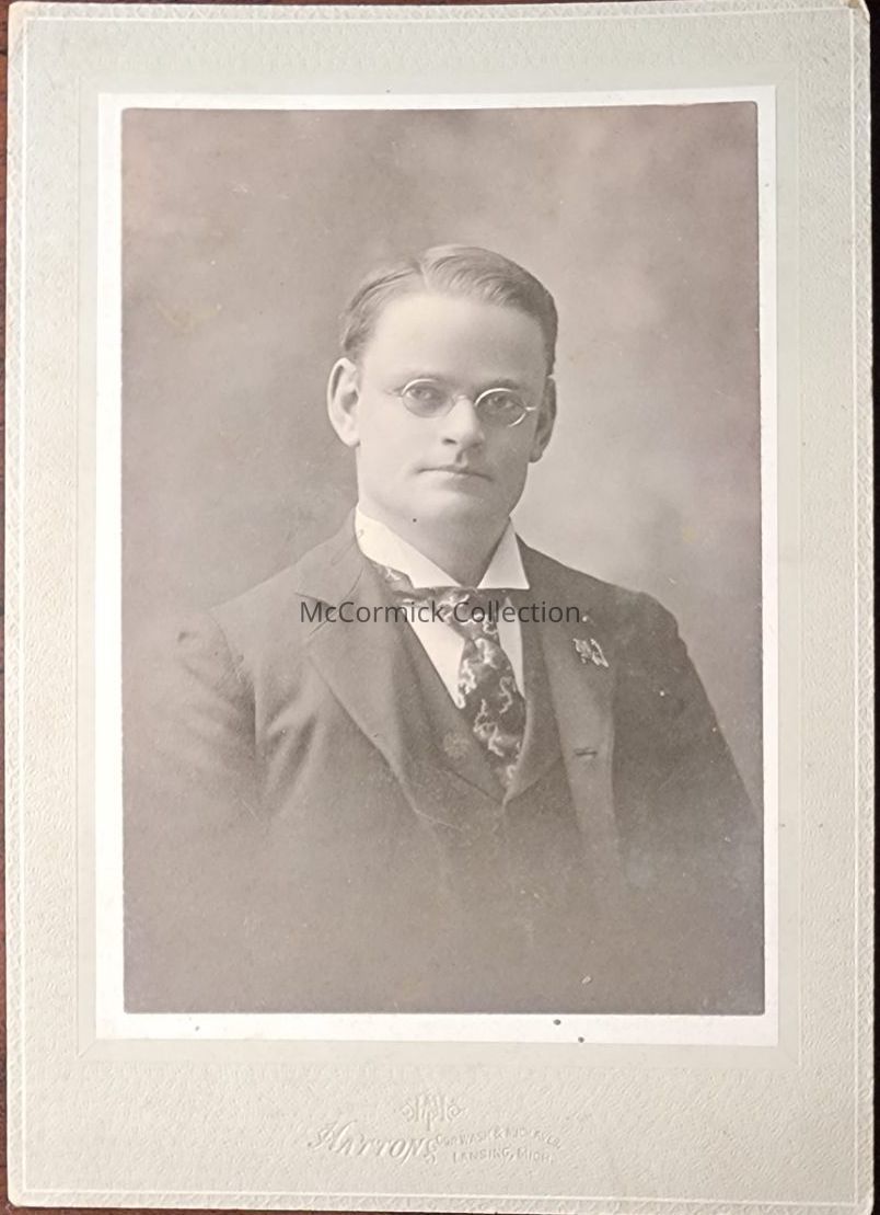 Card mounted photograph of George Campbell of Maple Rapids, Michigan, Class of 1898 Michigan Agricultural College. Photo by Lansing photographer Hatton. From O.W. Slayton Collection.