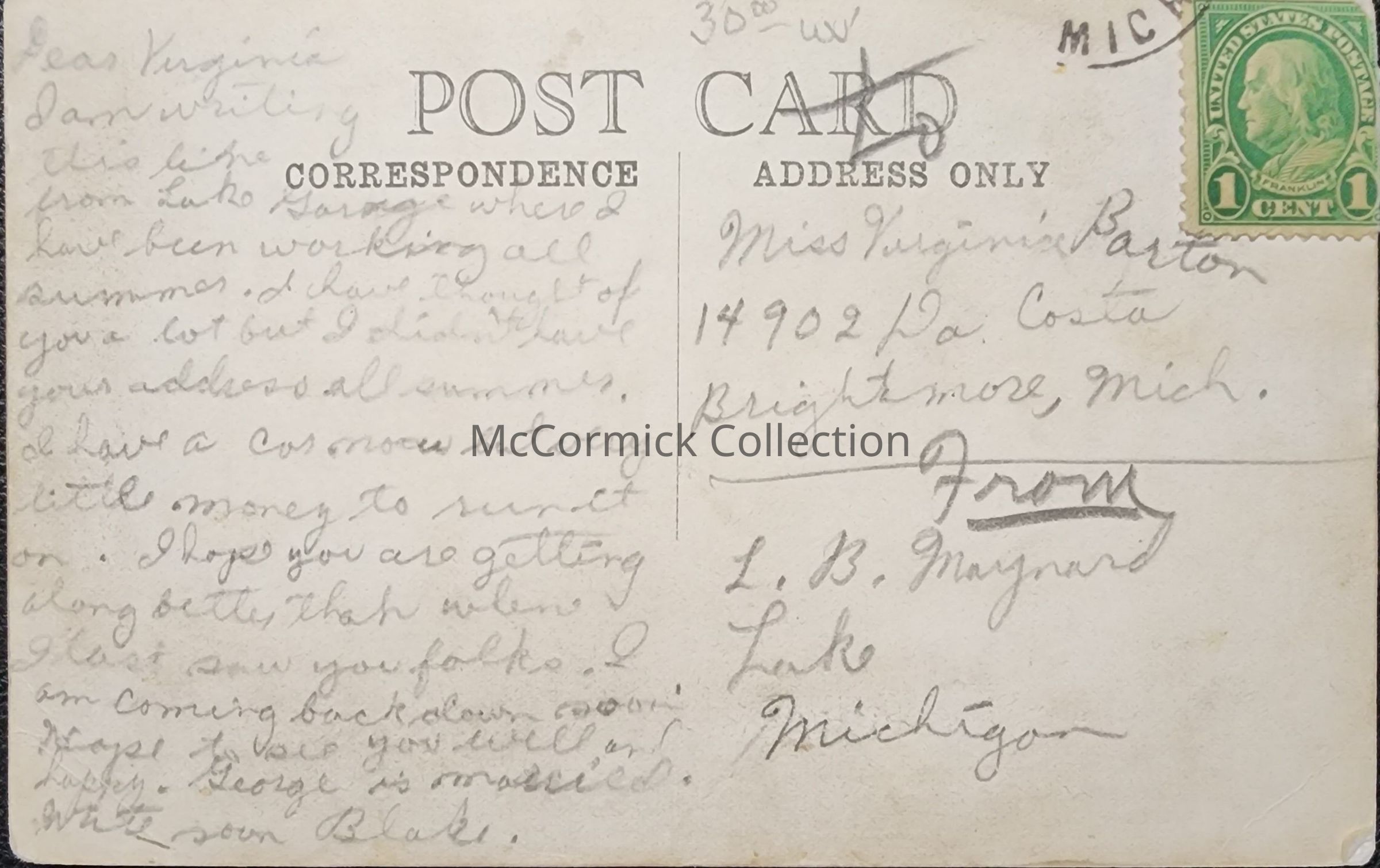Real photo postcard of the George Scott General Store in Lake, Michigan. Mobiloil advertising sign and gas pump. People gathered in front. Negative number is 20. Postally used, postmark cutoff. Addressed to Brightmore from L.B. Maynard of Lake.
