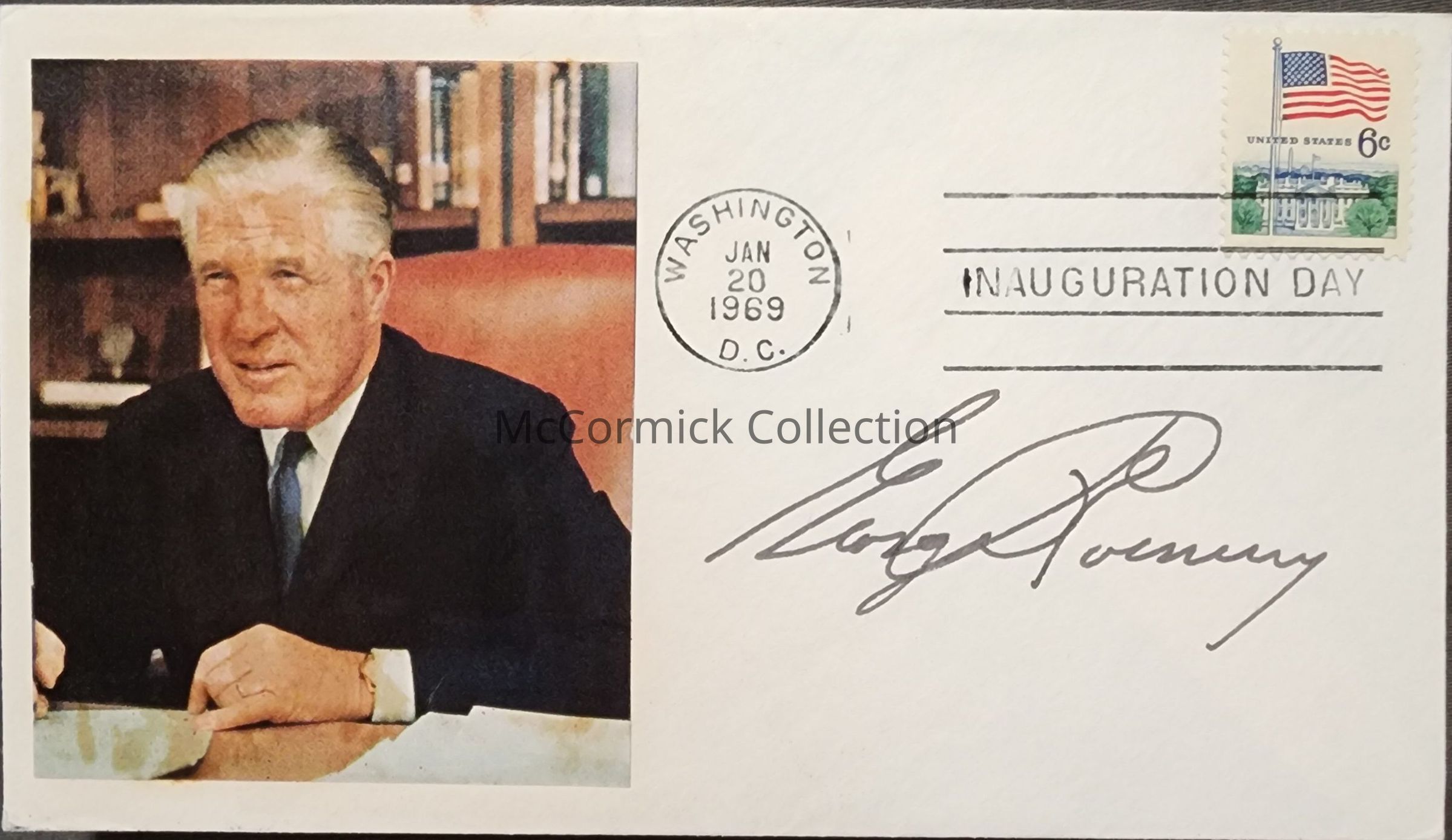 Postal cover from January 20, 1969, marking the inauguration of Richard Nixon as President of the United States, and George Romney as HUD secretary. Features an image of Romney, and a signature.