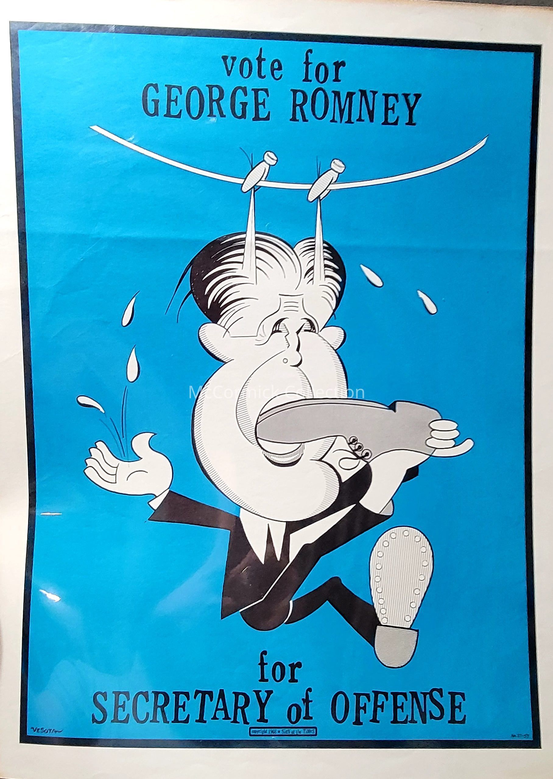 A blue, black, and white poster with a cartoon of Romney with a shoe in his mouth, reads: "Vote for George Romney for Secretary of Offense."