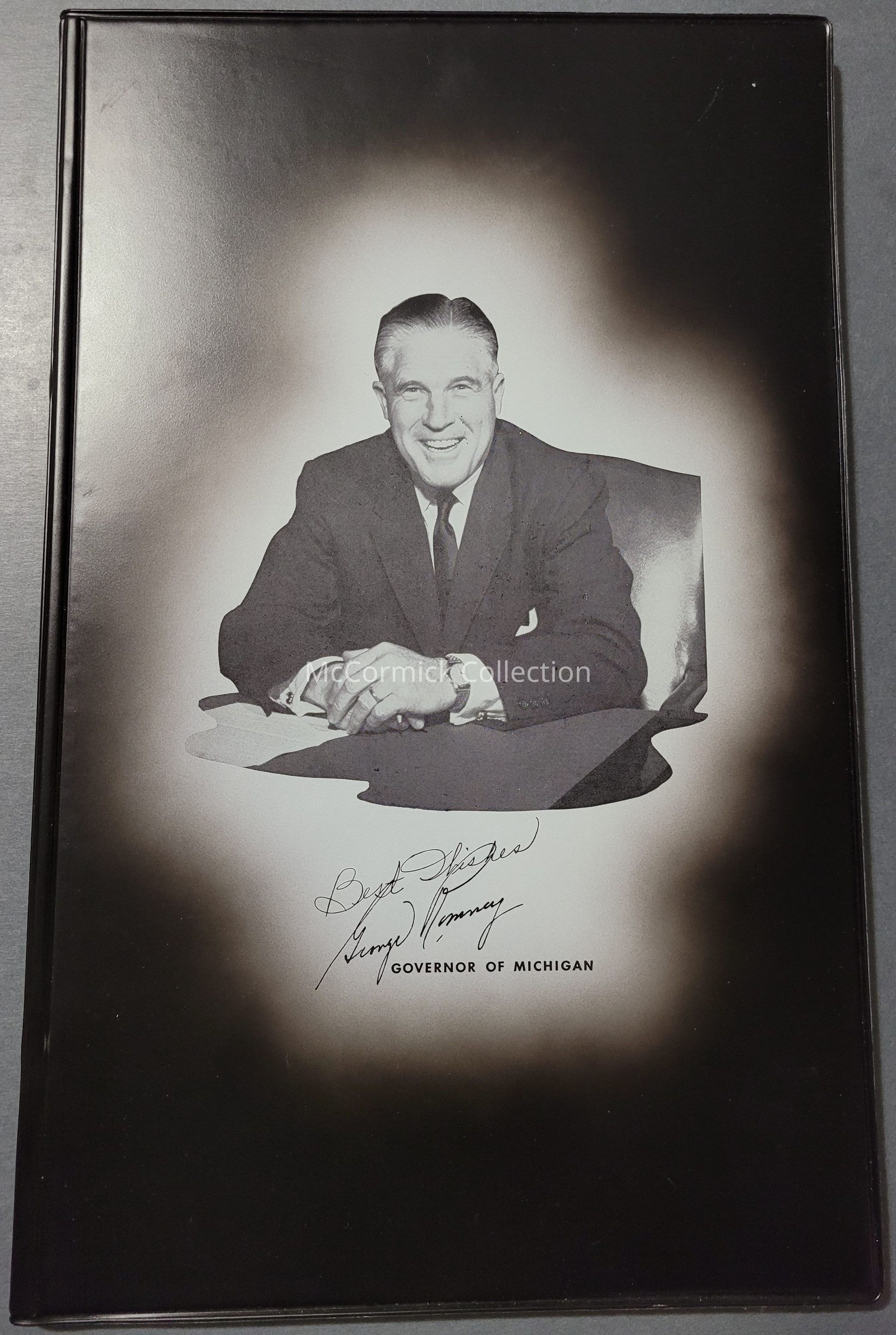 A black and white vinyl portfolio featuring George Romney on the cover with facsimile signature reading "Best Wishes George Romney Governor of Michigan." Circa 1960s.