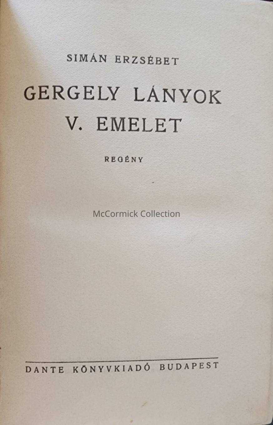 "Gergely Lanyok: V. Emelet," by Siman Erzsebet, published by Dante in Budapest, Hungary, circa 1938.