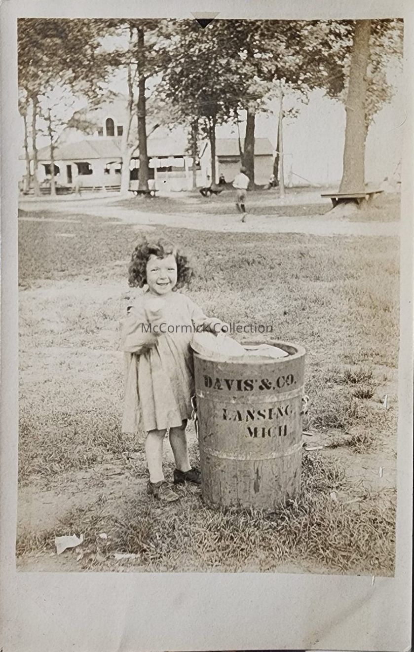 Real photo postcard of a girl with a barrel labeled "Davis & Co., Lansing, Mich." Taken in a park, maybe Waverly Park or Lake Lansing. Postally unused.