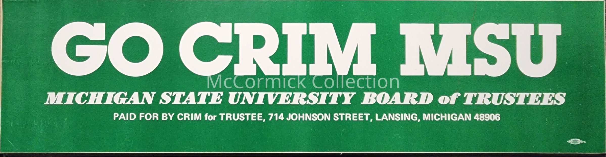 A bumper sticker for Bobby Crim for Michigan State University trustee, 1983-1984.