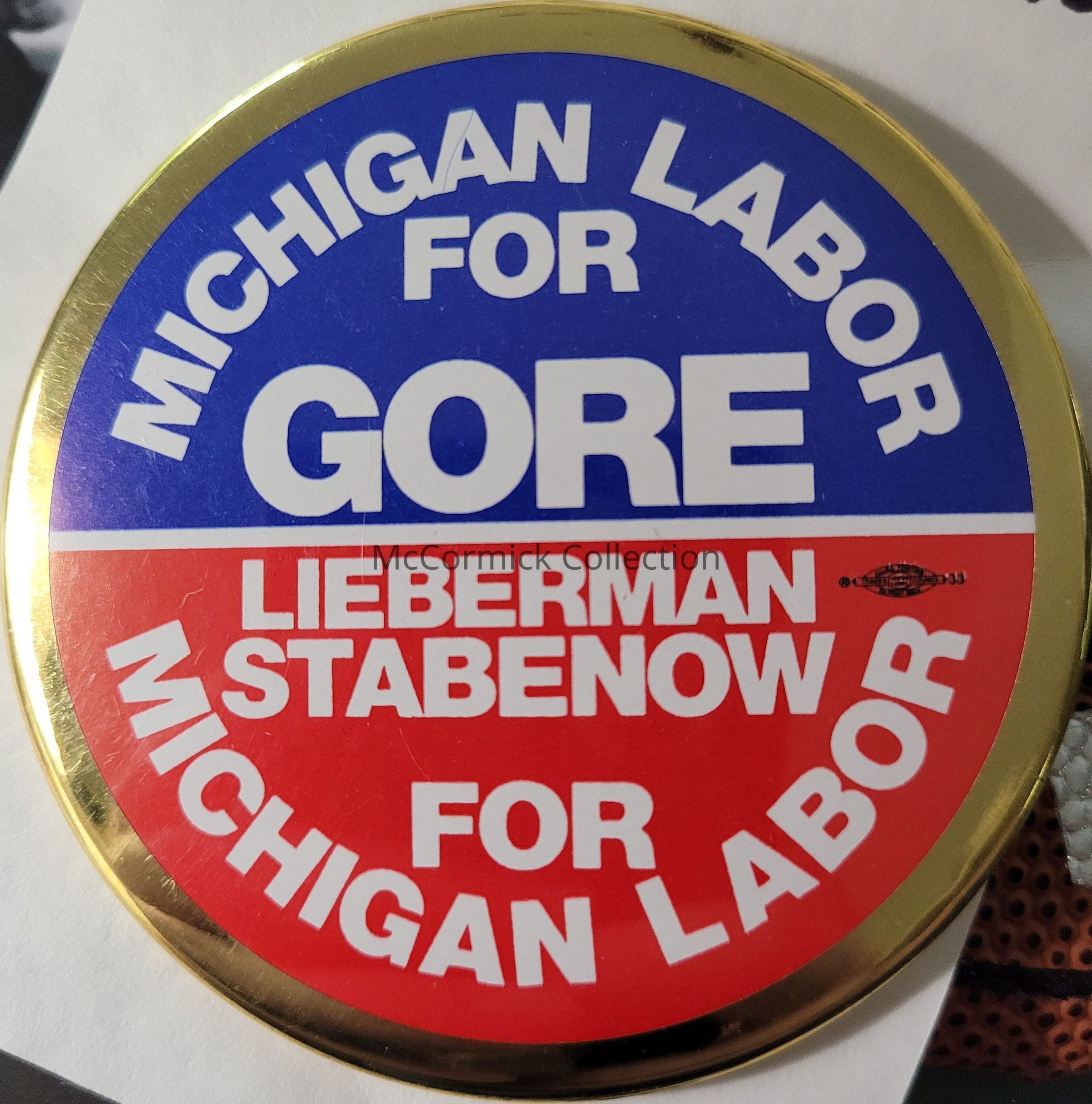 Political button, 3" coattail for Michigan Labor for Al Gore for President, Joe Lieberman for Vice President, and Debbie Stabenow for U.S. Senator, 2000.