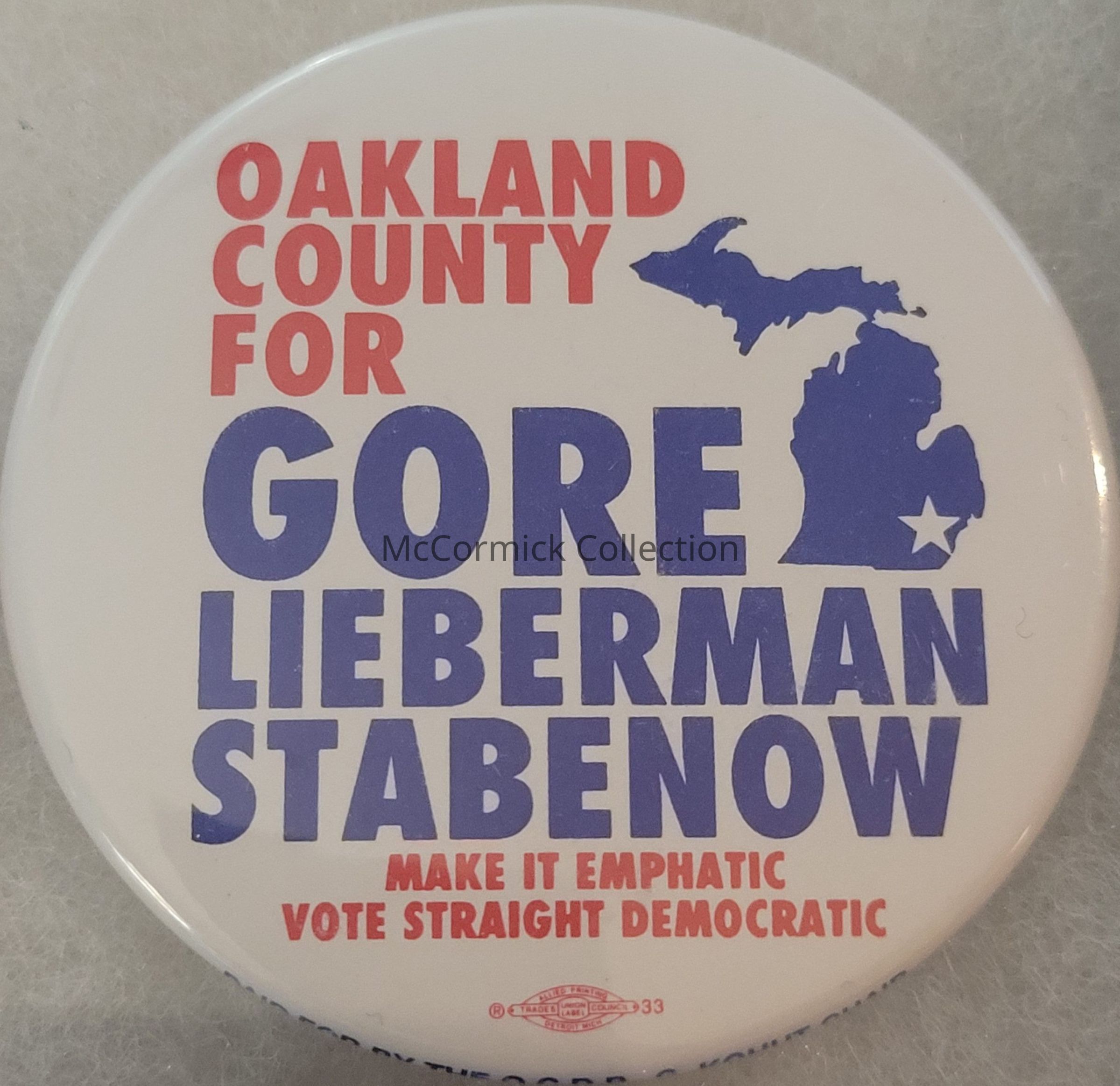 A 2.25" red, white, and blue political button for Al Gore for President, Joe Lieberman for Vice President, and Debbie Stabenow for U.S. Senator, 2000. Slogan is "Oakland County for Gore Lieberman Stabenow / Make it Emphatic Vote Straight Democratic."