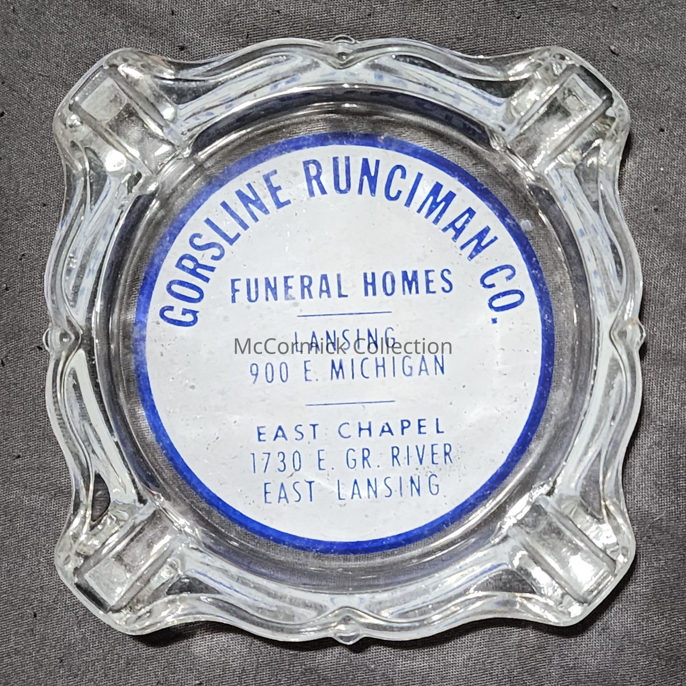 A glass advertising ashtray for Gorsline Runciman Funeral Homes in Lansing and East Lansing, Michigan.