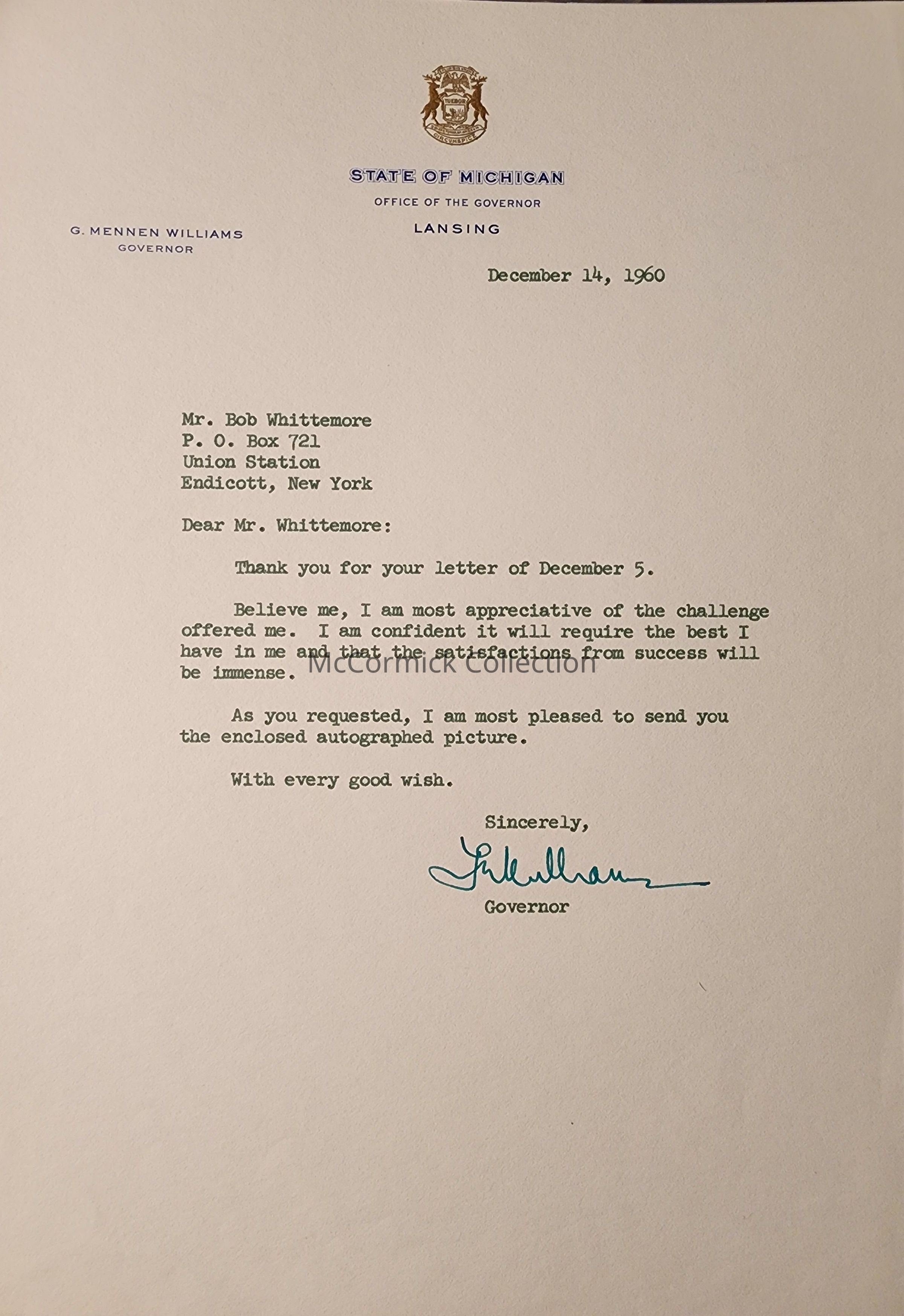 Written on executive stationery. Addressed to Bob Whittemore of New York. Signed by Gov. Williams in green ink. Dated December 14, 1960.