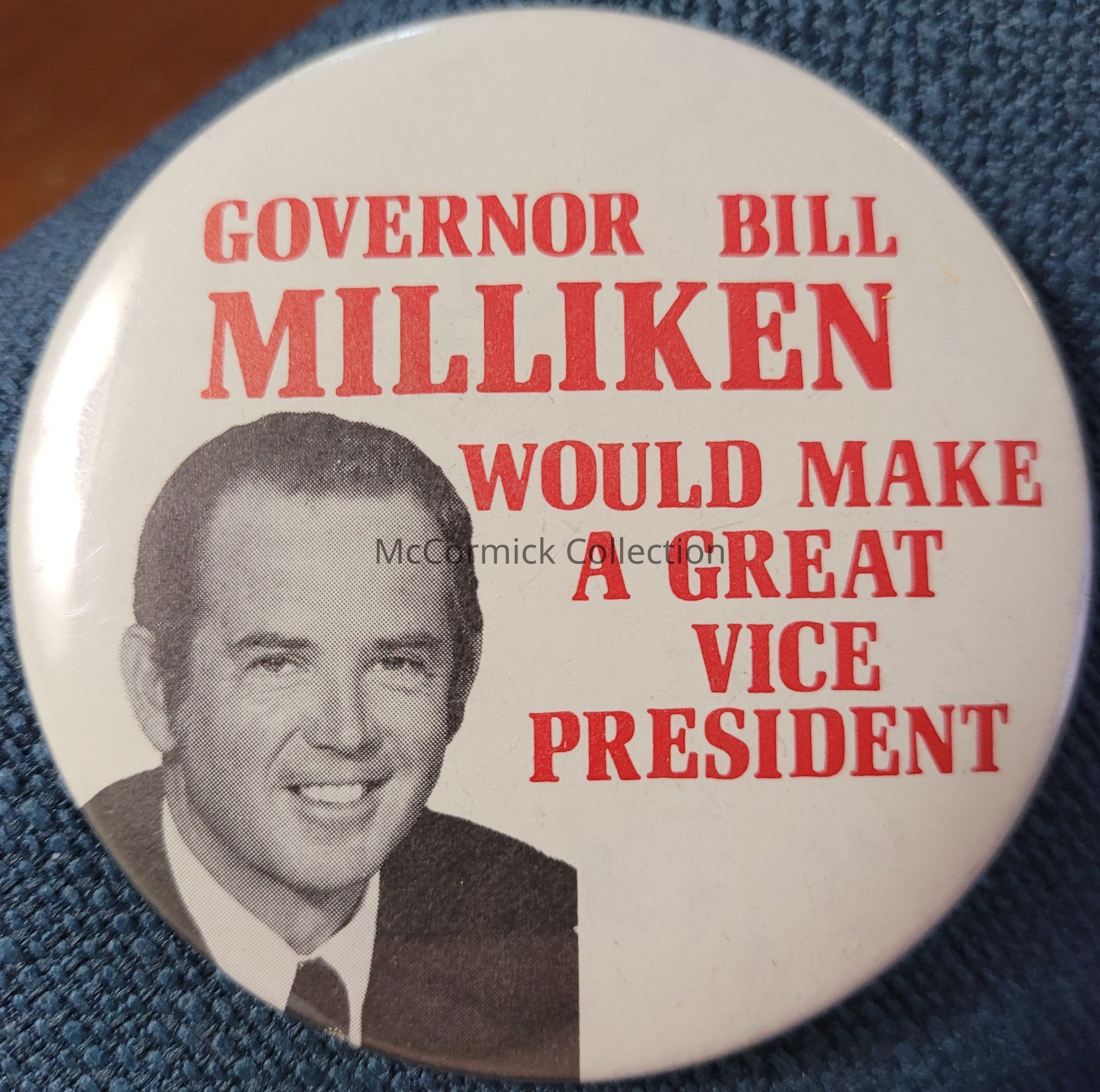 Political hopeful button advocating that Governor William Milliken "would make a great Vice President," circa 1970s-80s.