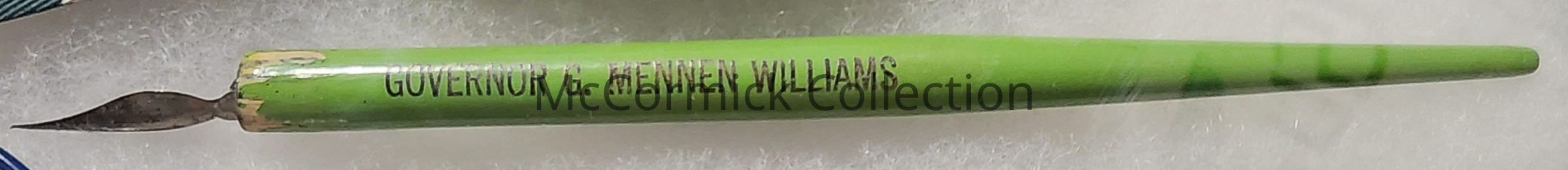 A green and black fountain pen for Governor G. Mennen Williams. Made of wood.