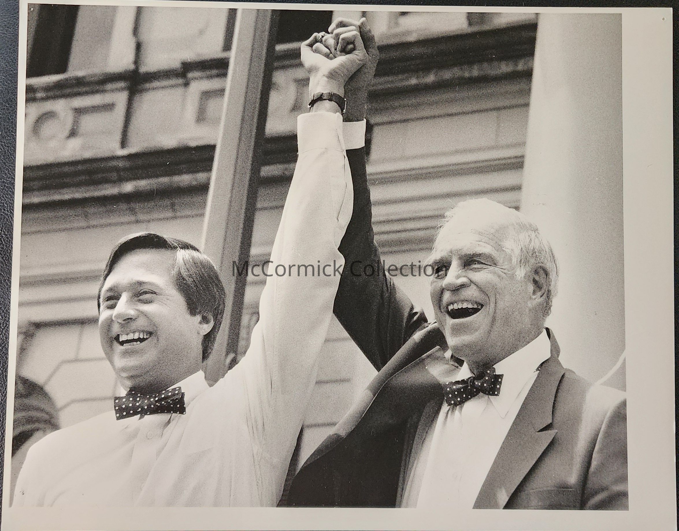 A 1986 press photograph for Governor James Blachard and former Governor G. Mennen Williams. Taken by Detroit Free Press photographer Al Kamuda on Williams Day upon Soapy's retirement from public office after 50 years.