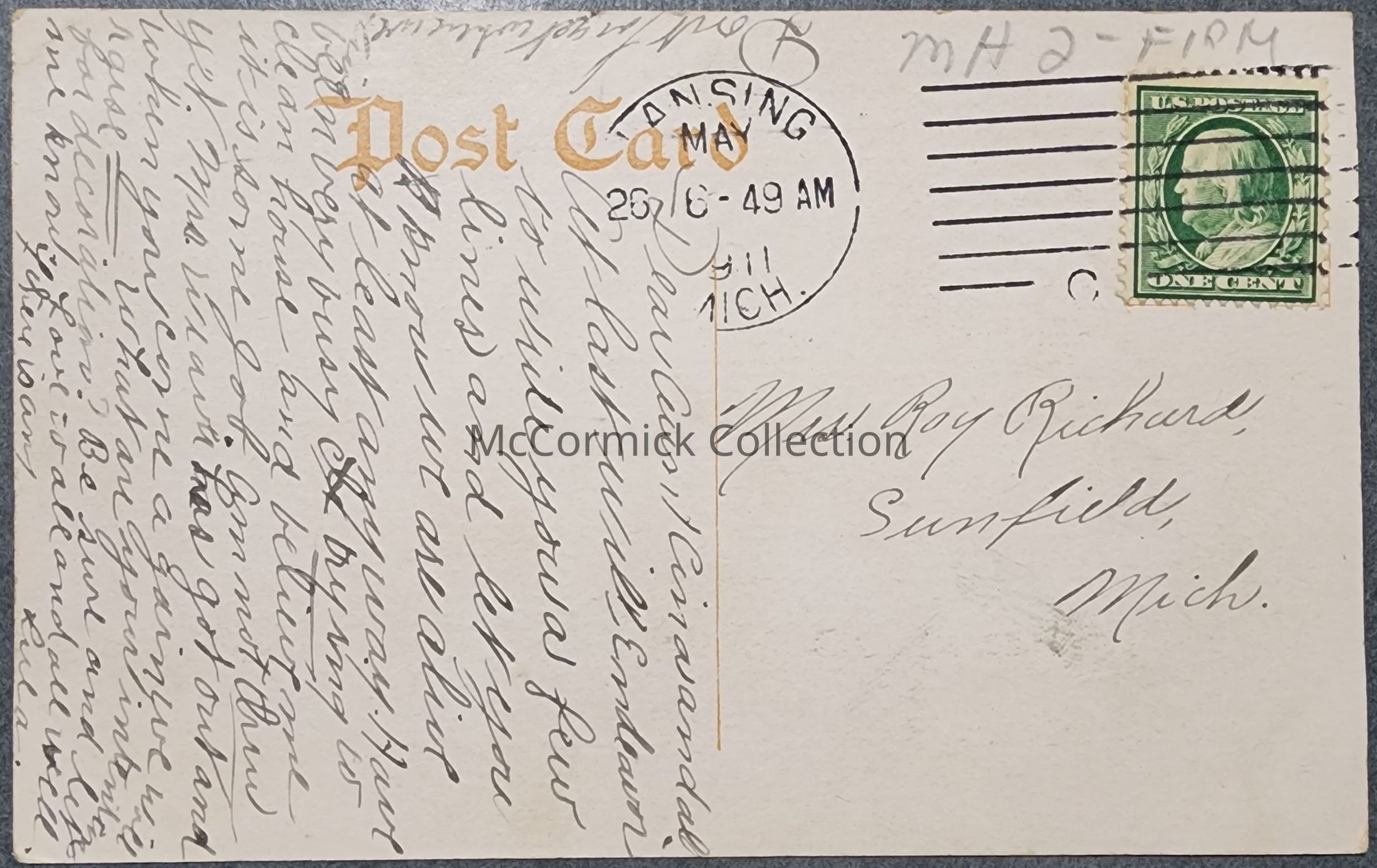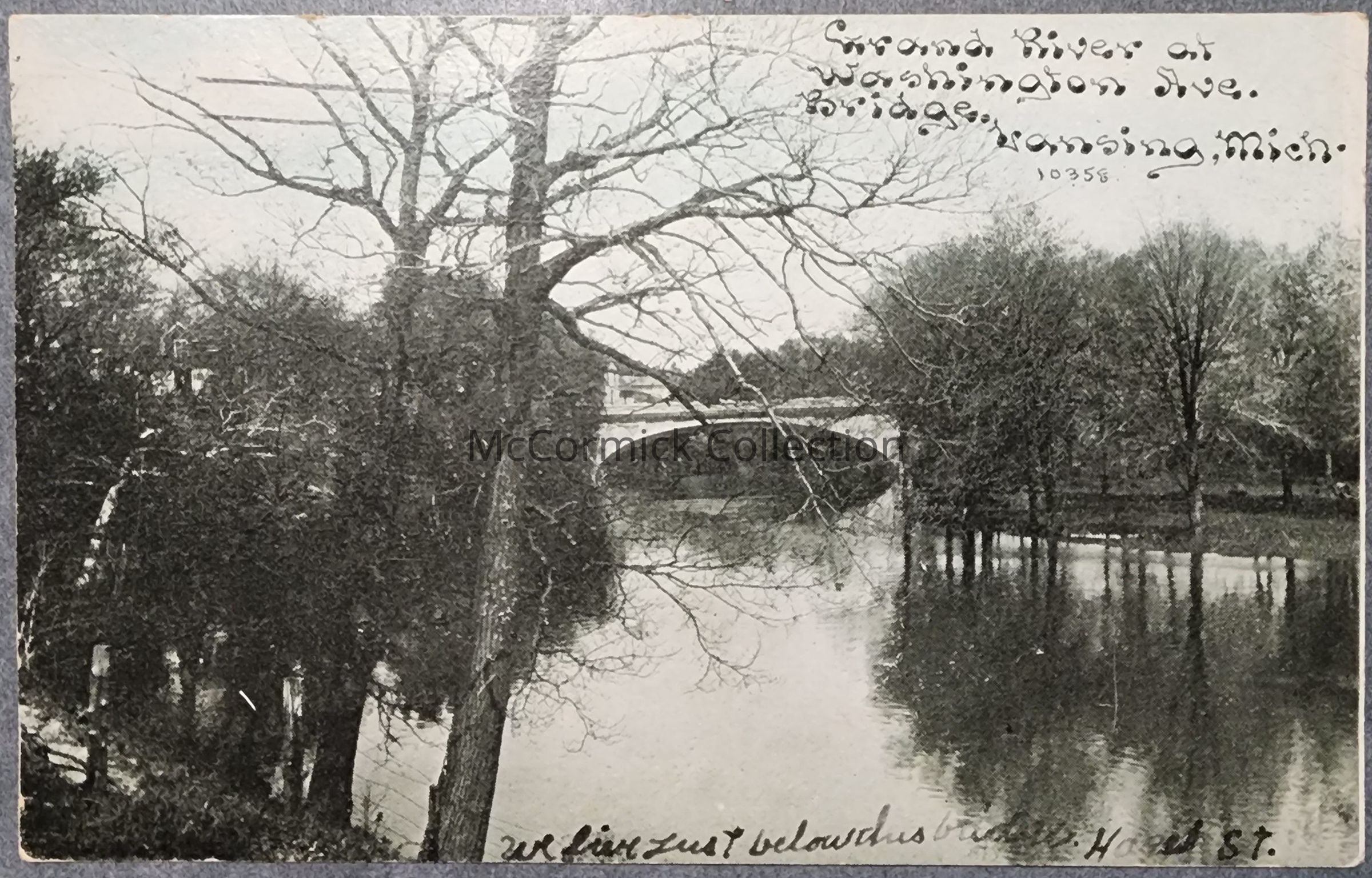 Postcard of the Grand River at the Washington Avenue Bridge in Lansing, Michigan. Postally used, 1911 Lansing postmark.