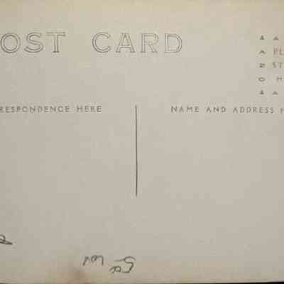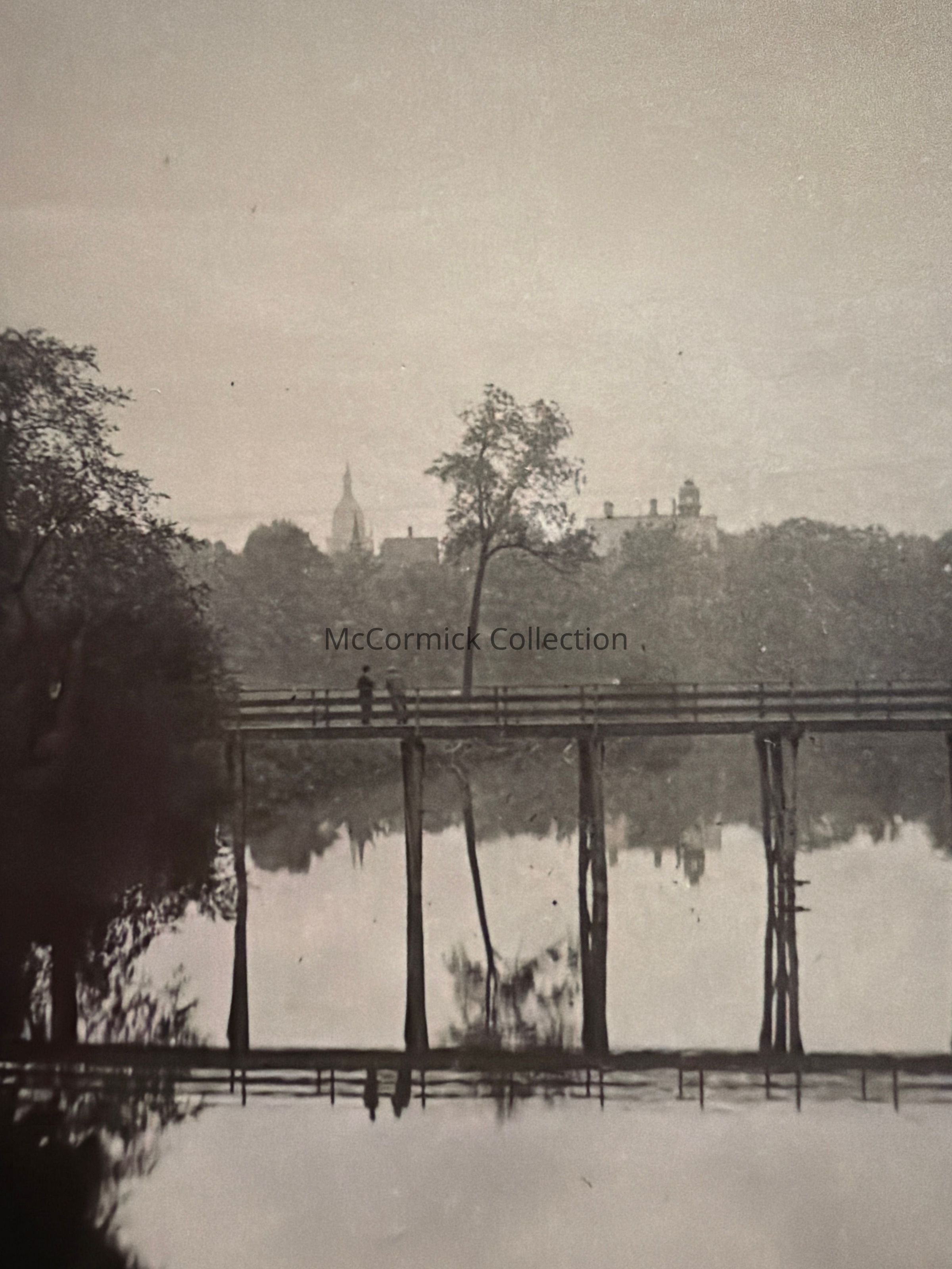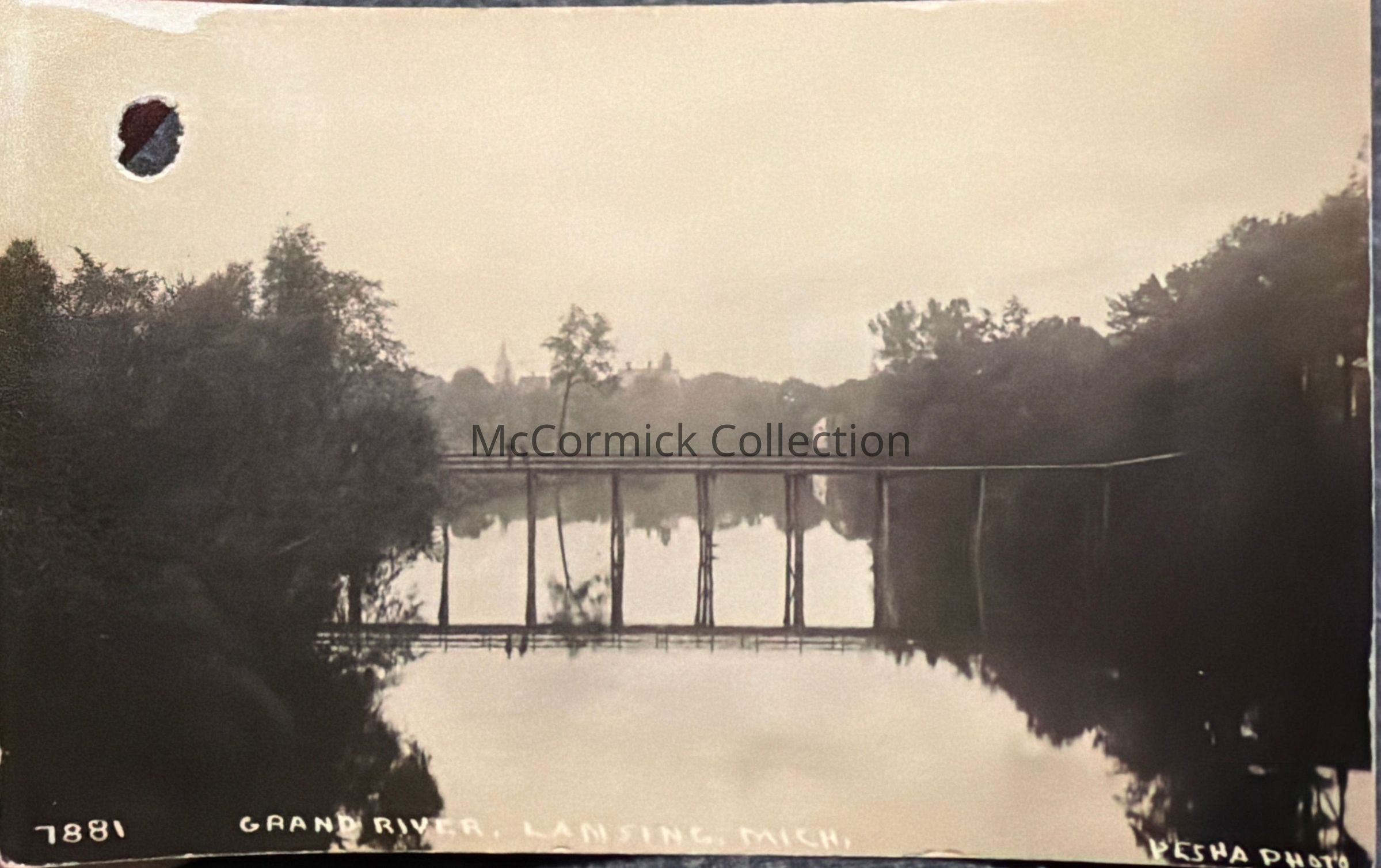 Real photo postcard of the Grand River and a bridge over the river in the foreground with portions of the Lansing skyline in the background including the State Capitol dome and the tower of the Barnes Castle. Taken from the south. Postally unused. Removed from Pesha salesman sample, hole from brad.