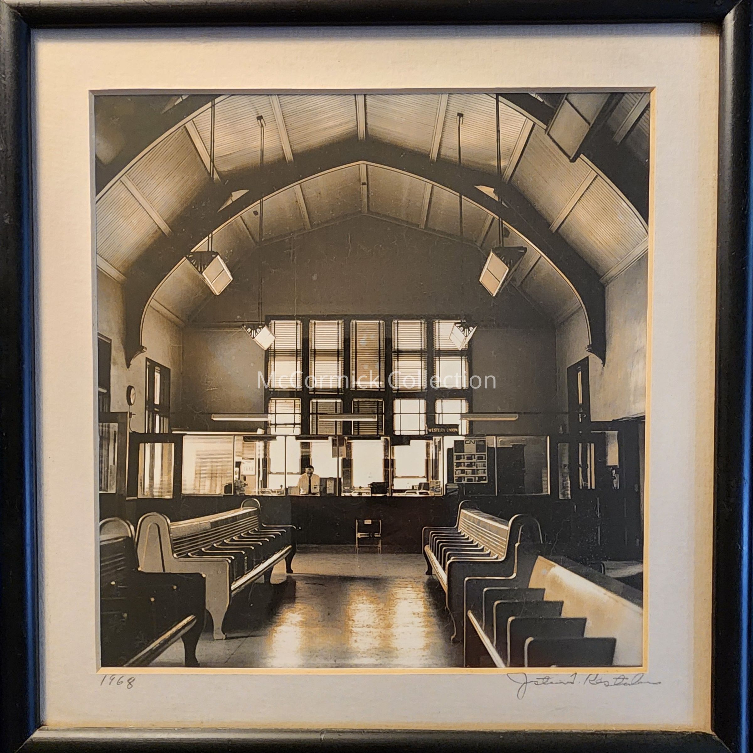 Framed photograph of the interior of the Grand Trunk Railroad Depot on South Washington Ave., in Lansing, Michigan. Photo taken in 1968 by MSU history professor, local historian, and author Justin Kestenbaum.