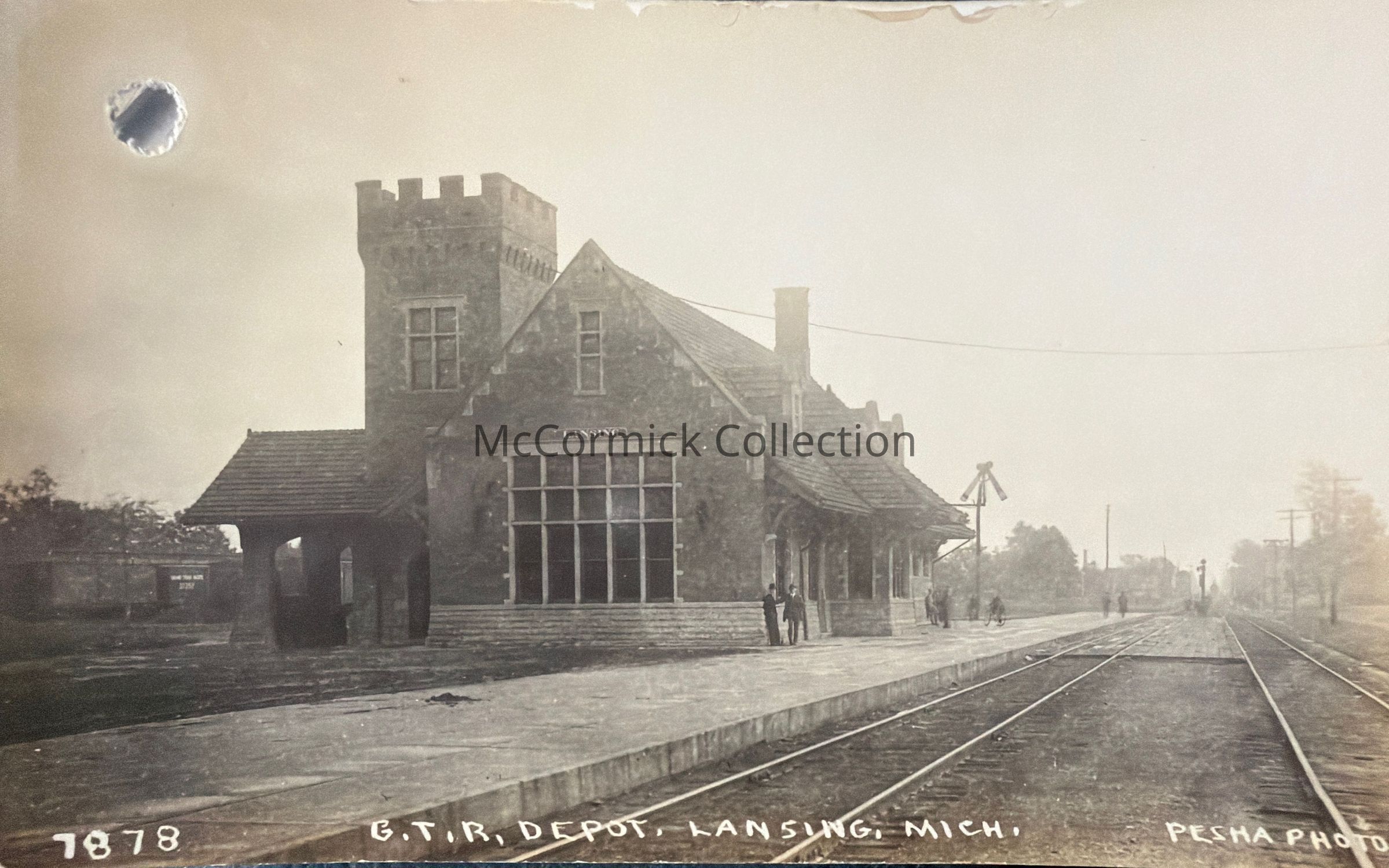 Real photo postcard of the Grand Trunk Railroad Depot in Lansing by photographer Pesha. Postally unused. Removed from Pesha salesman sample, hole from brad.
