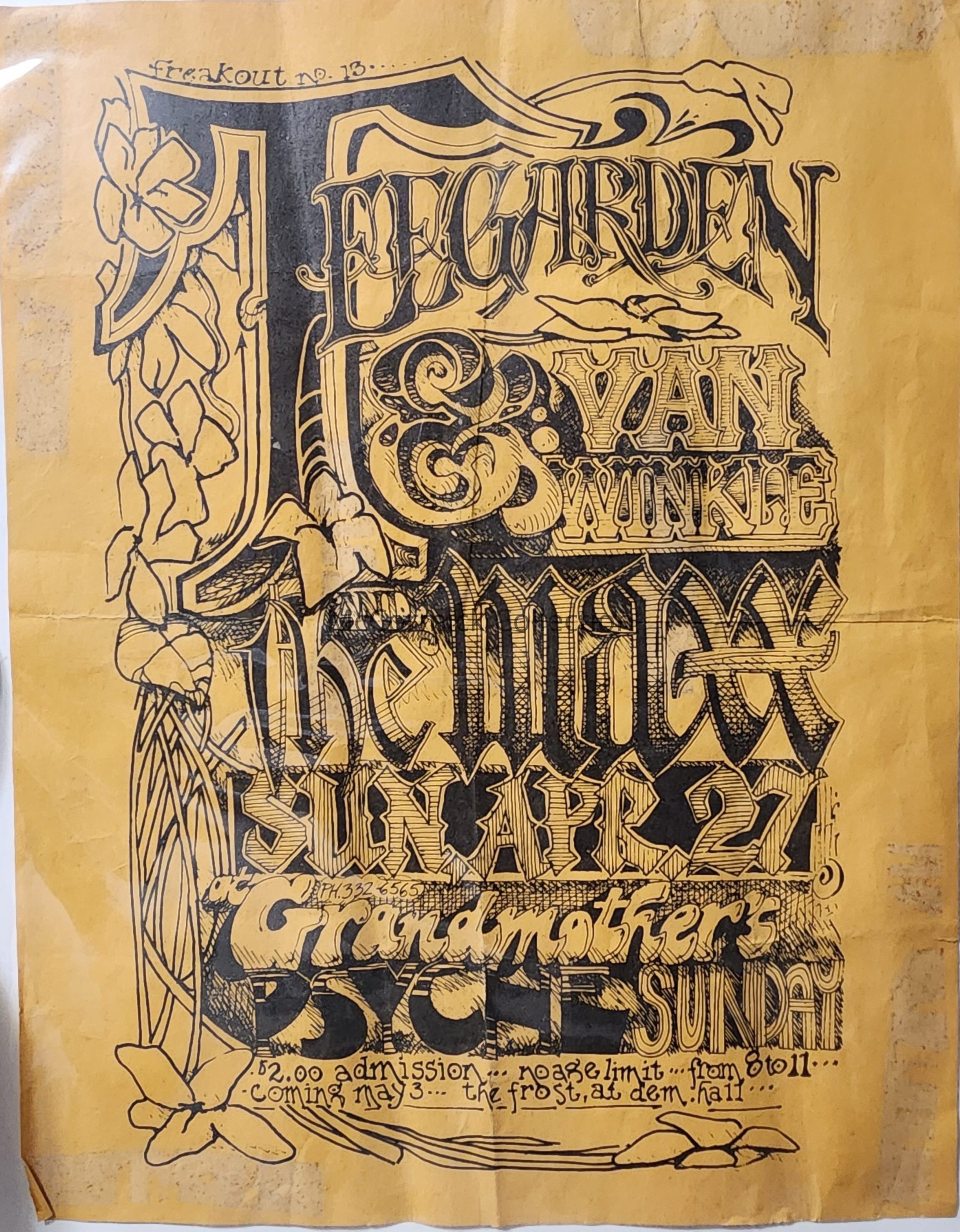 Paper flier for Teegarten & Van Winkle and the Maxx / Sun. Apr. 27, at Grandmother's Psyche Sunday/ $2.00 admission... no age limit... from 8 to 11...coming May 3... Frost, at Dem Hall. Labeled Freakout No. 13.