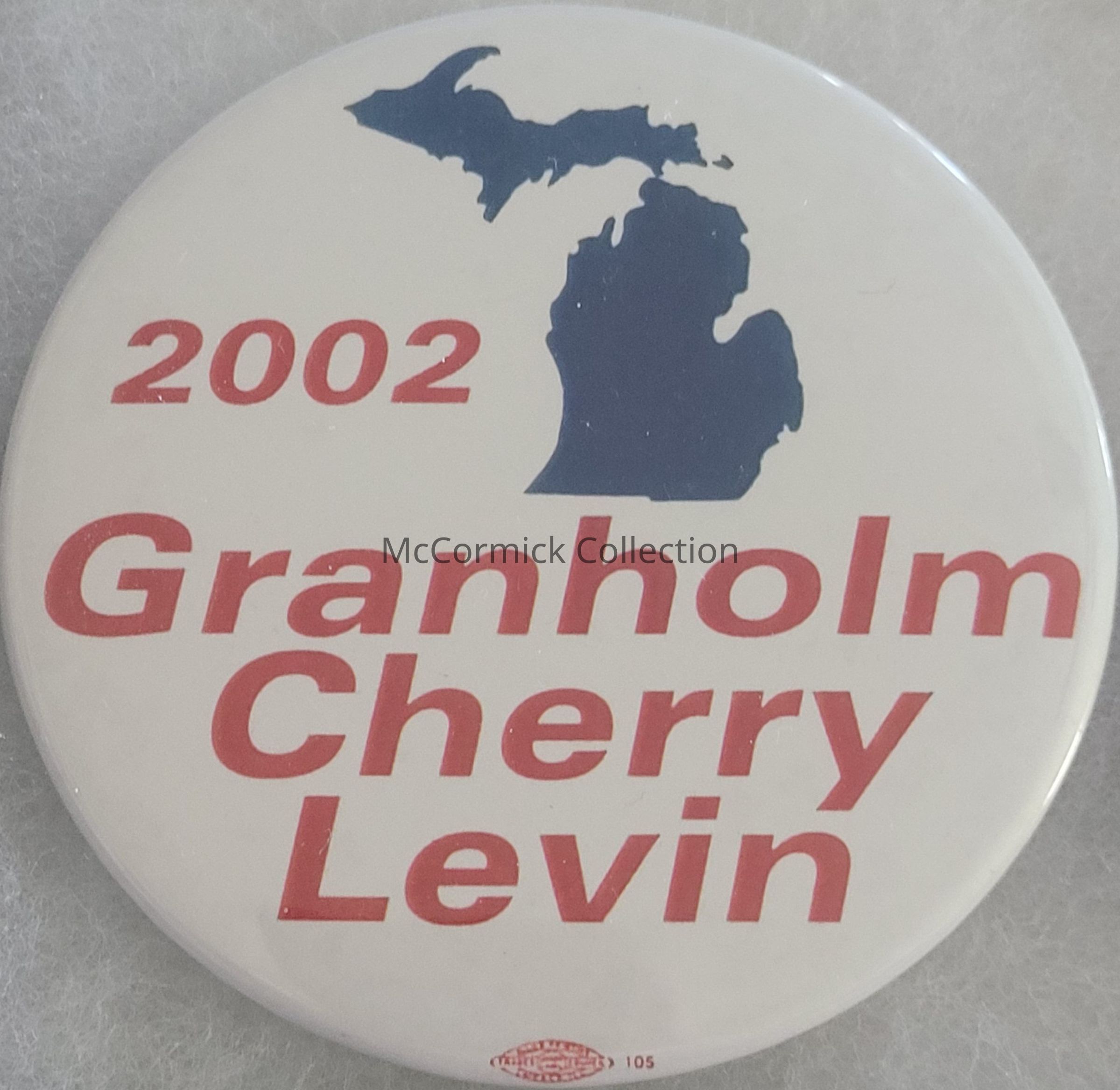 A 3" red, white, and blue political coattail button for Jennifer Granholm for Governor, John Cherry for Lt. Governor, and Carl Levin for U.S. Senate, 2002.