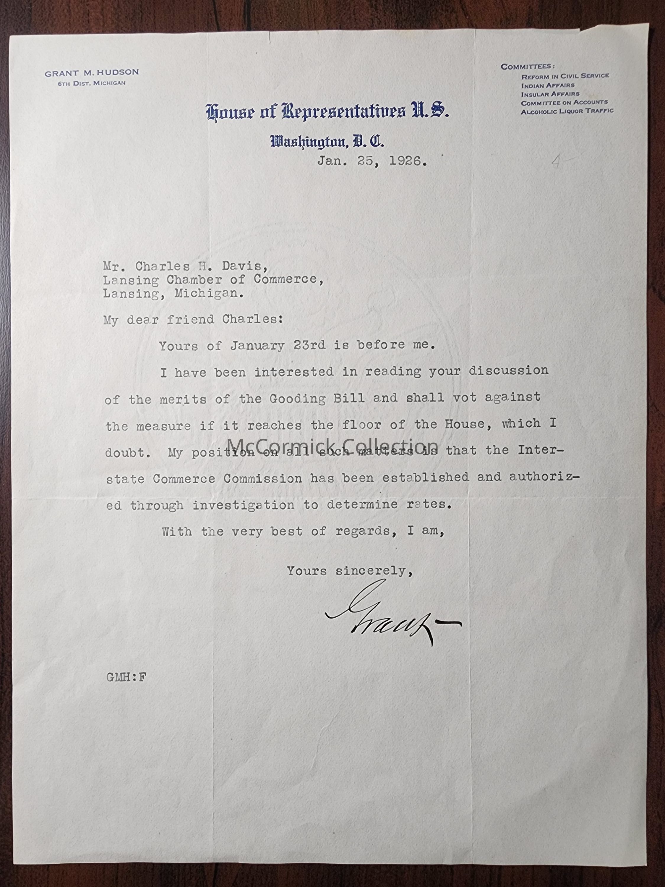 A letter on United States Congress 6th District Michigan stationery from Rep. Grant M. Hudson to Charles M. Davis of the Lansing Chamber of Commerce. Dated 1926. Signed "Grant."