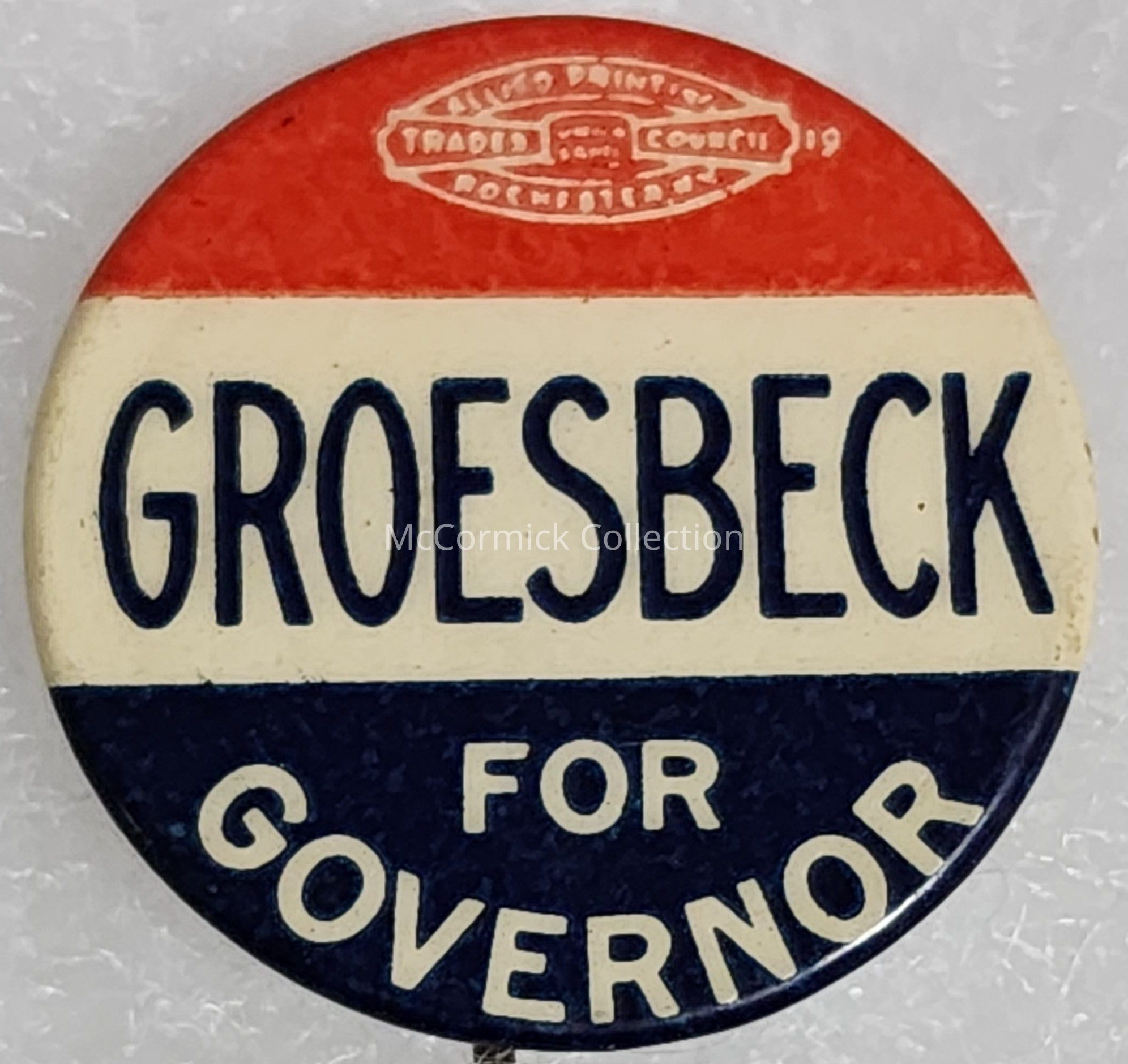 Political button for Michigan Governor Alex J. Groesbeck. Red, white, and blue button.