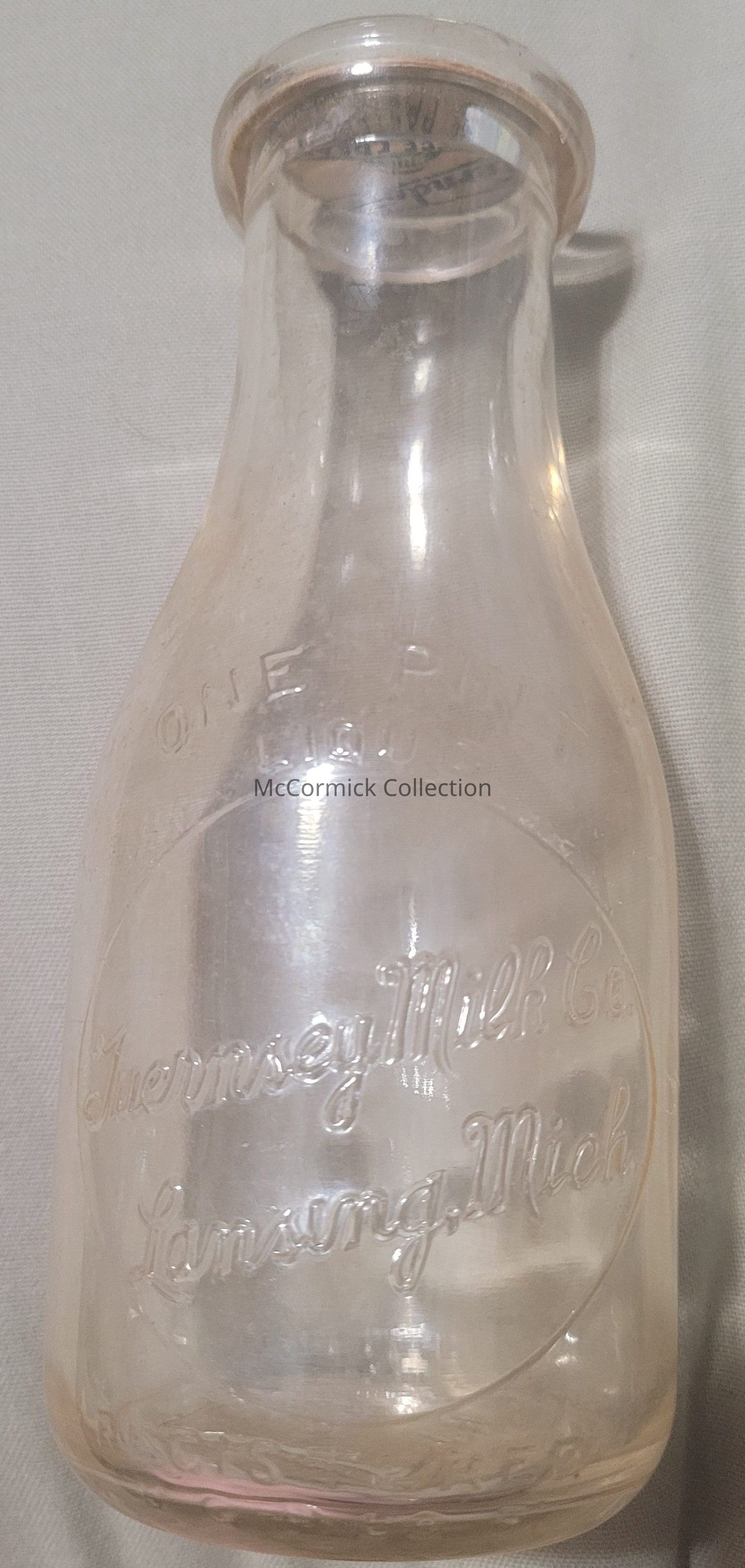 An embossed pint bottle with slug plate for Guernsey Milk Co. of Lansing, Mich. There was a Guernsey Milk Co. in North Holt, Michigan as well, and this may be the same dairy. Some Holt dairies labeled as Lansing as it was their primary distribution area.