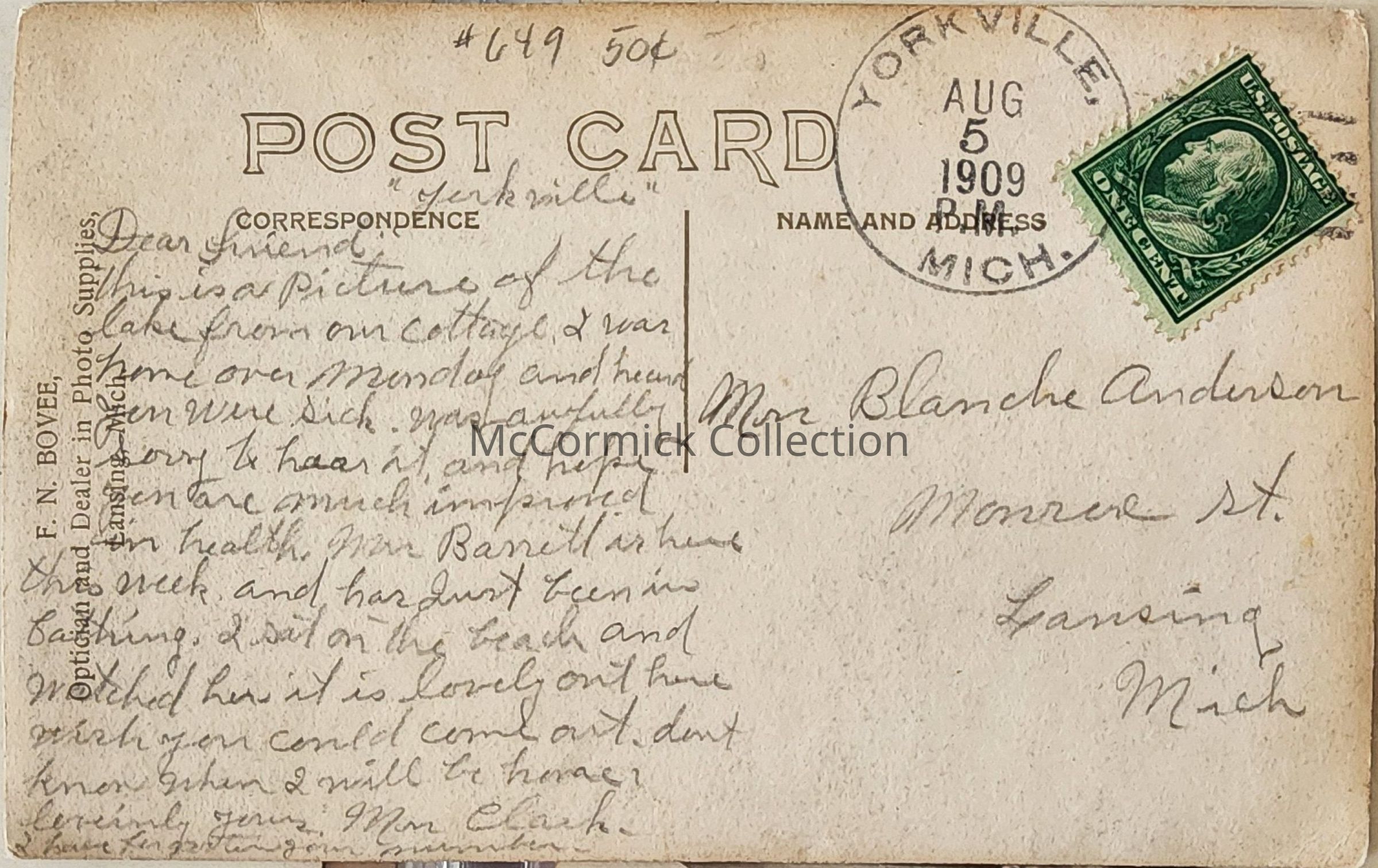 Real photo postcard of Gull Lake at Yorkville, Michigan, dated 1909, and developed by Lansing photographer Bovee.