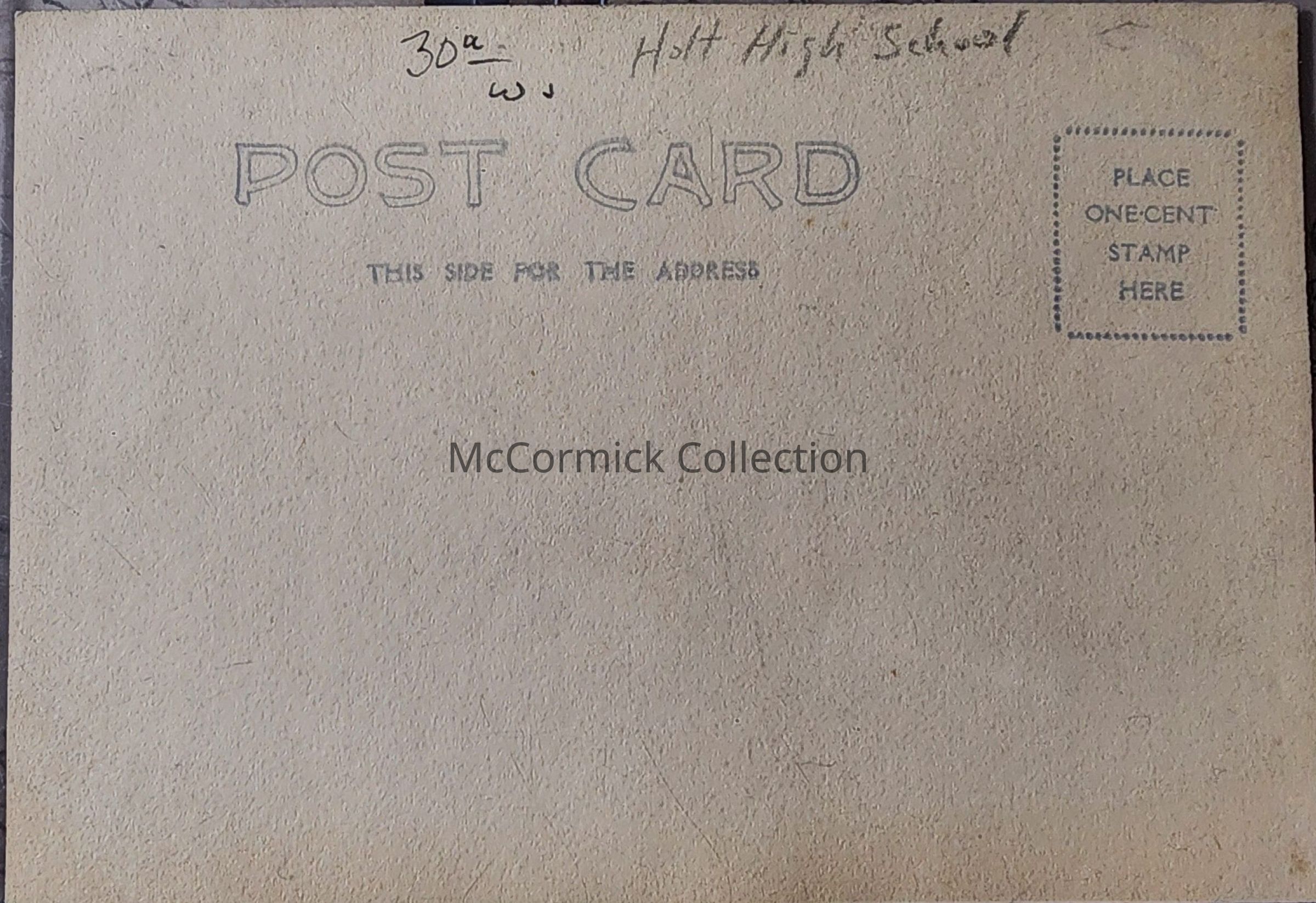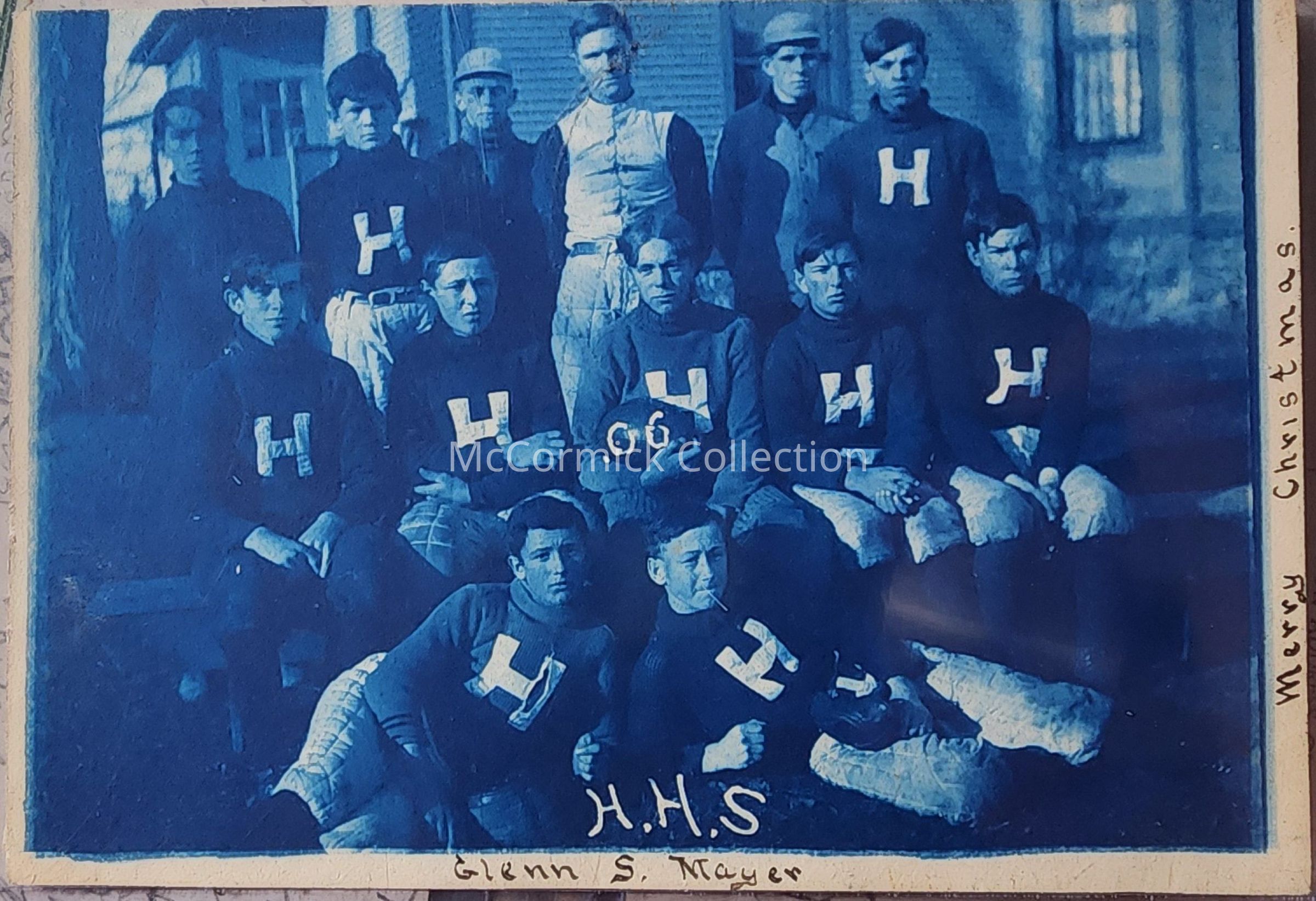 Real photo cyanotype postcard of the Holt High School football team in 1906. Handwritten are "Merry Christmas" and "Glenn S. Mayer." Postally unused.