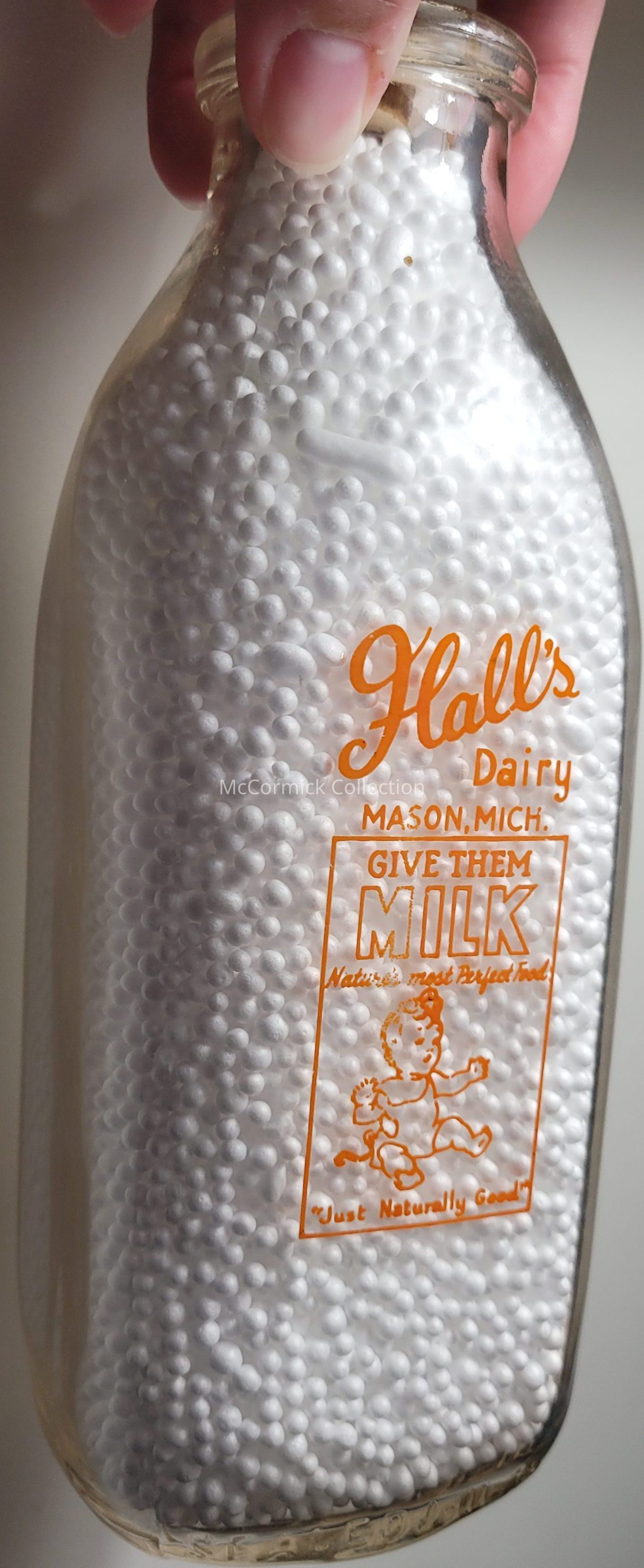 An orange pyro square quart bottle from Hall's Dairy in Mason, Michigan. Features baby image and slogan.