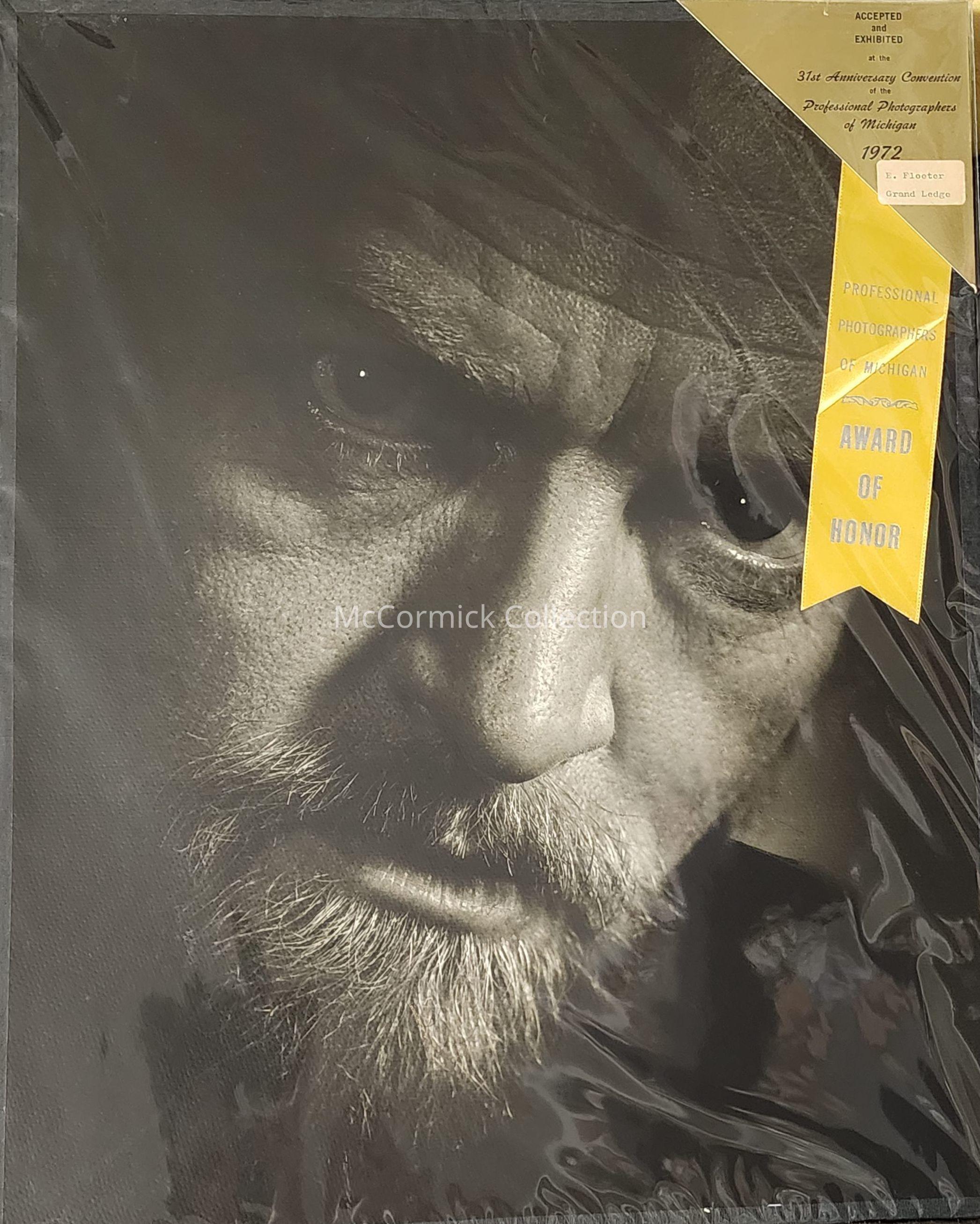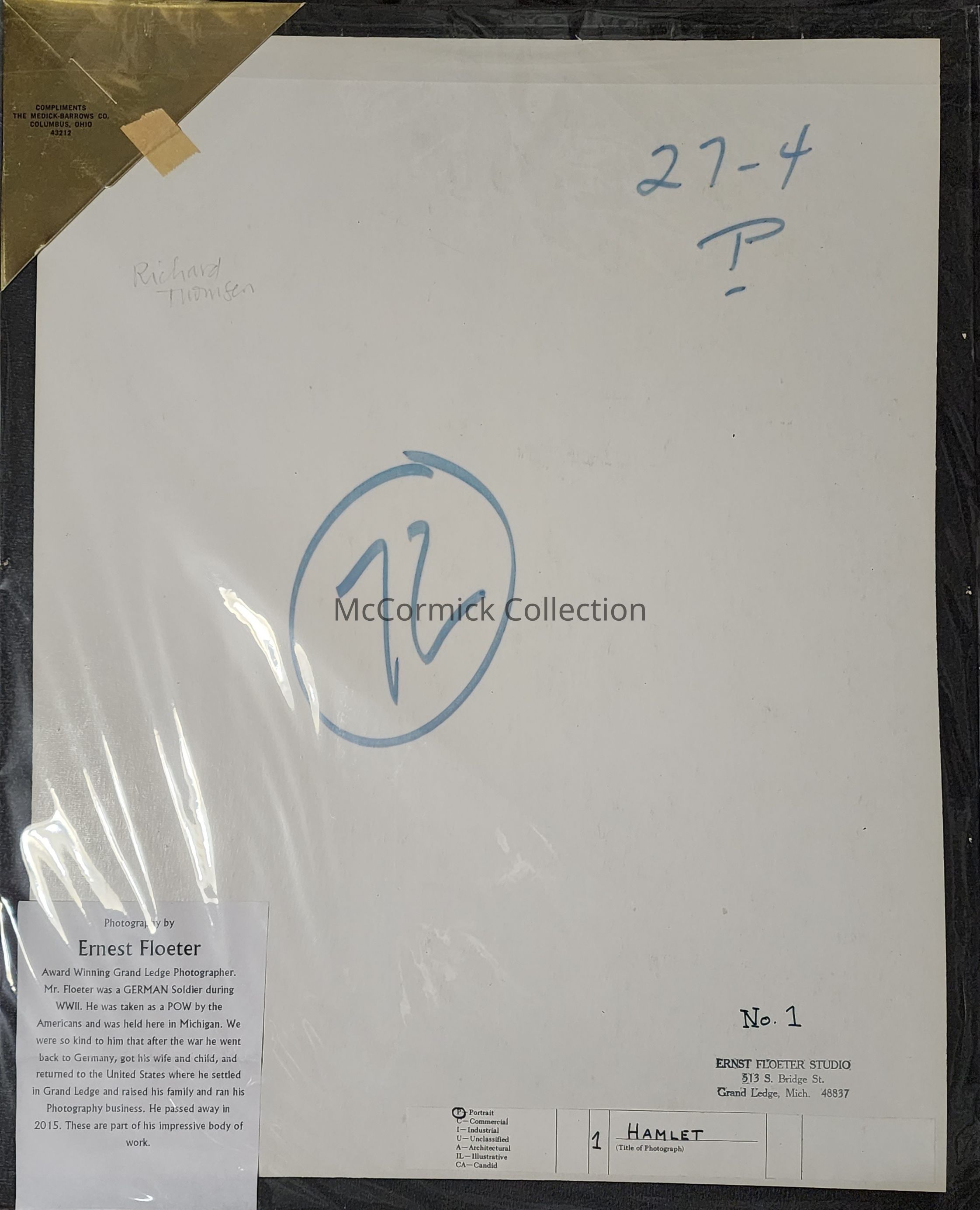 Large format photographic print of Richard Thomsen as Hamlet by Grand Ledge photographer Ernst Floeter, accepted and exhibited at the 1972 Michigan Professional Photographers Convention. Includes the Award of Honor.