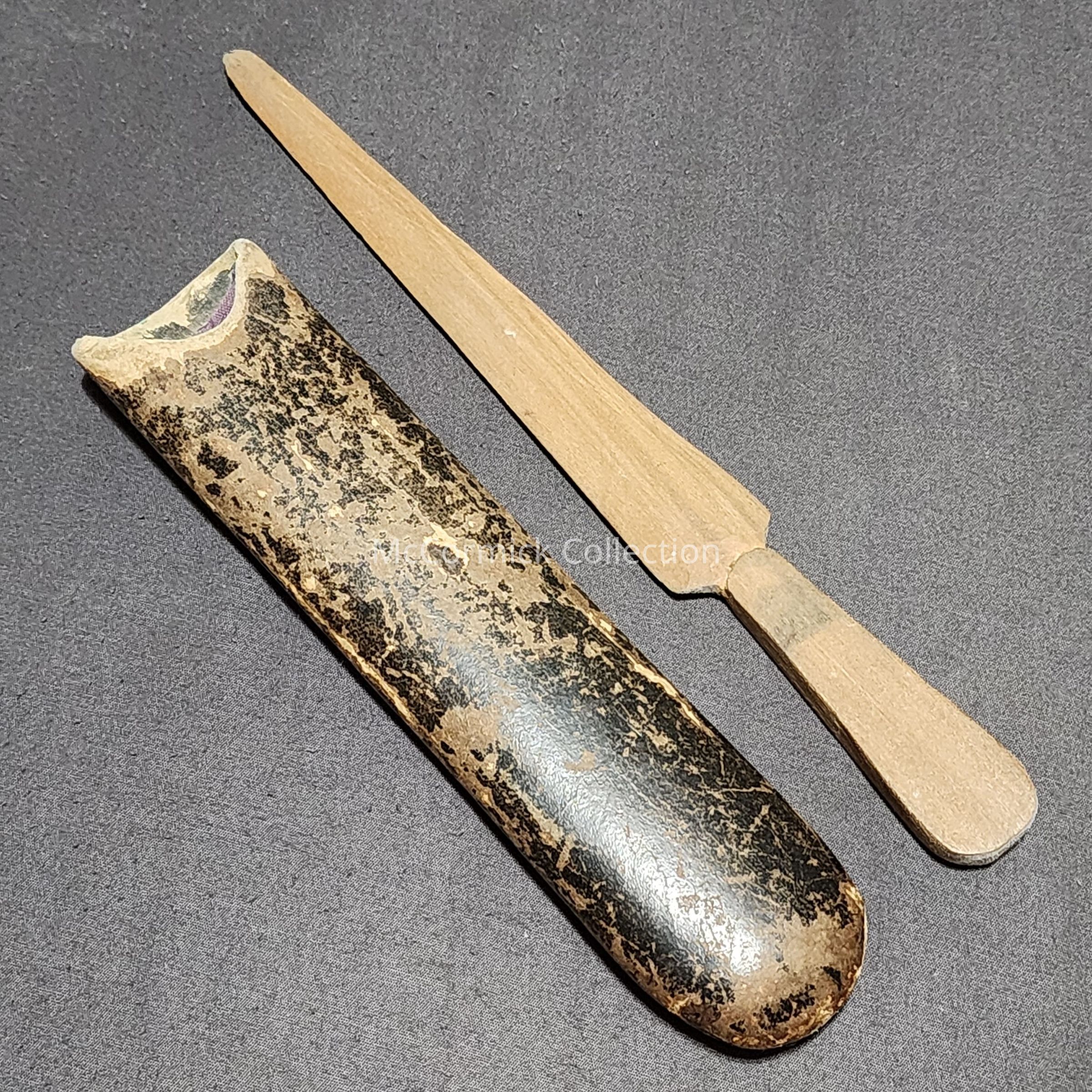 Wood handcarved letter opener with sheath. Family piece, belonged to Poulton or Reed family.