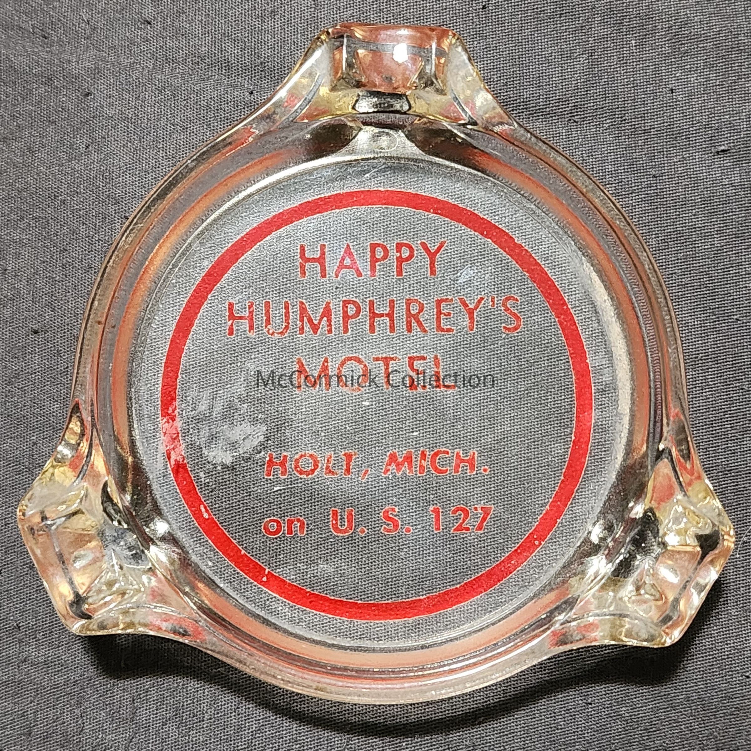 A glass advertising ashtray for Happy Humphrey's Motel in Holt, Michigan.