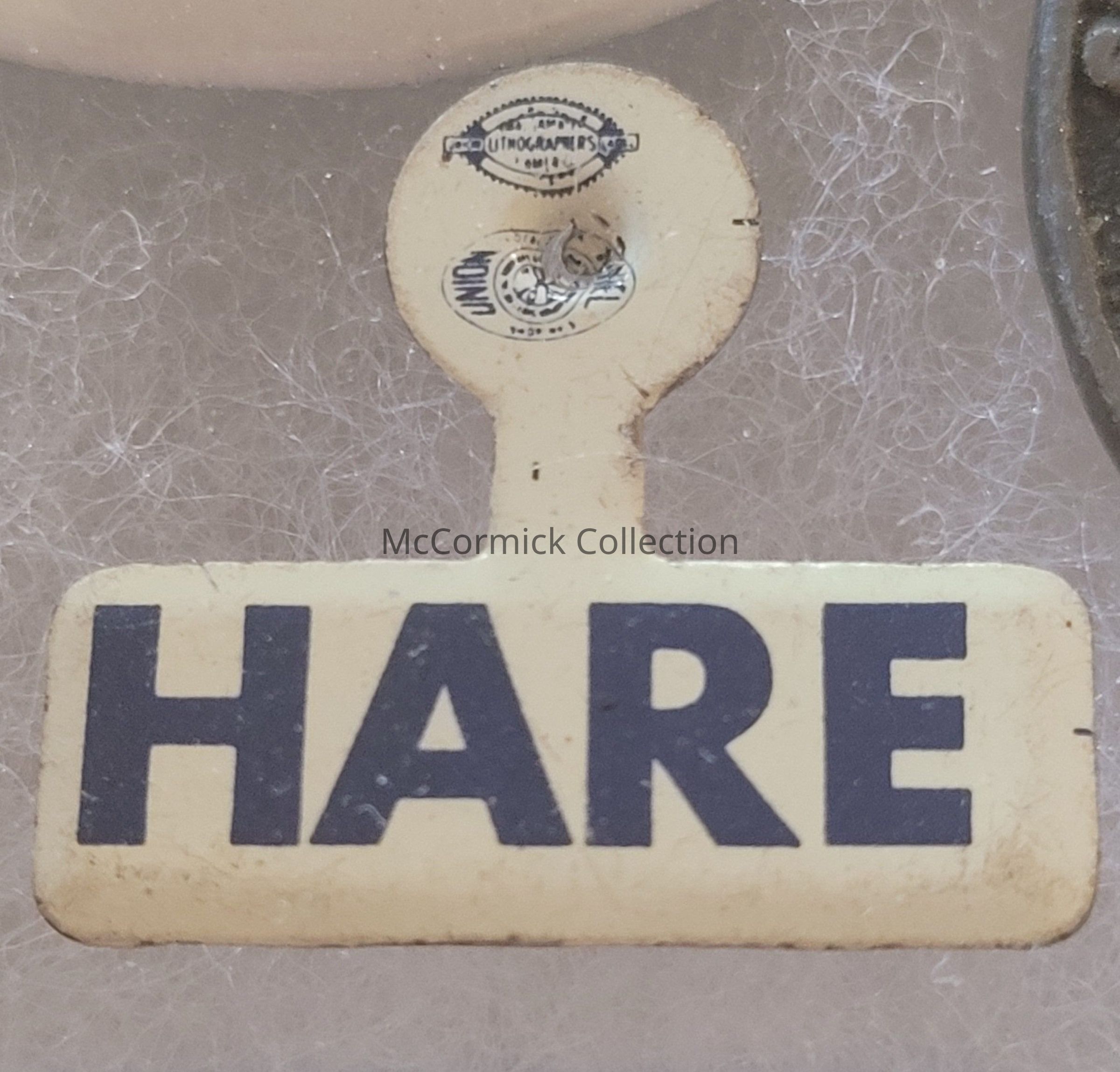 A small 1" blue and white tab for James M. Hare, likely from his terms as Michigan Secretary of State, possibly from his gubernatorial run in 1960.