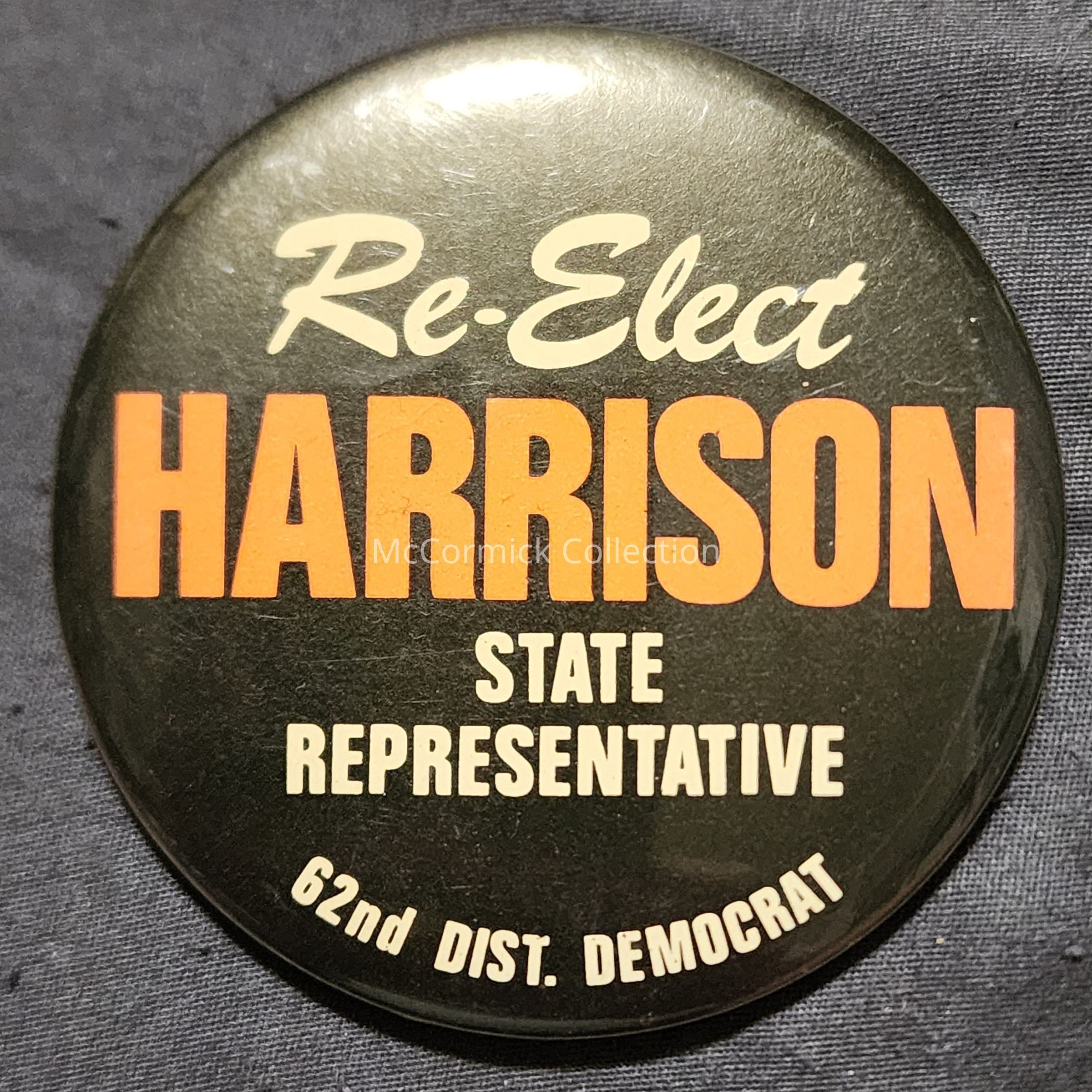 A 2.5" black, white, and orange political button for Charlie Harrison Reelection as State Representative, 62nd District, Democrat. From Kingdon Collection.