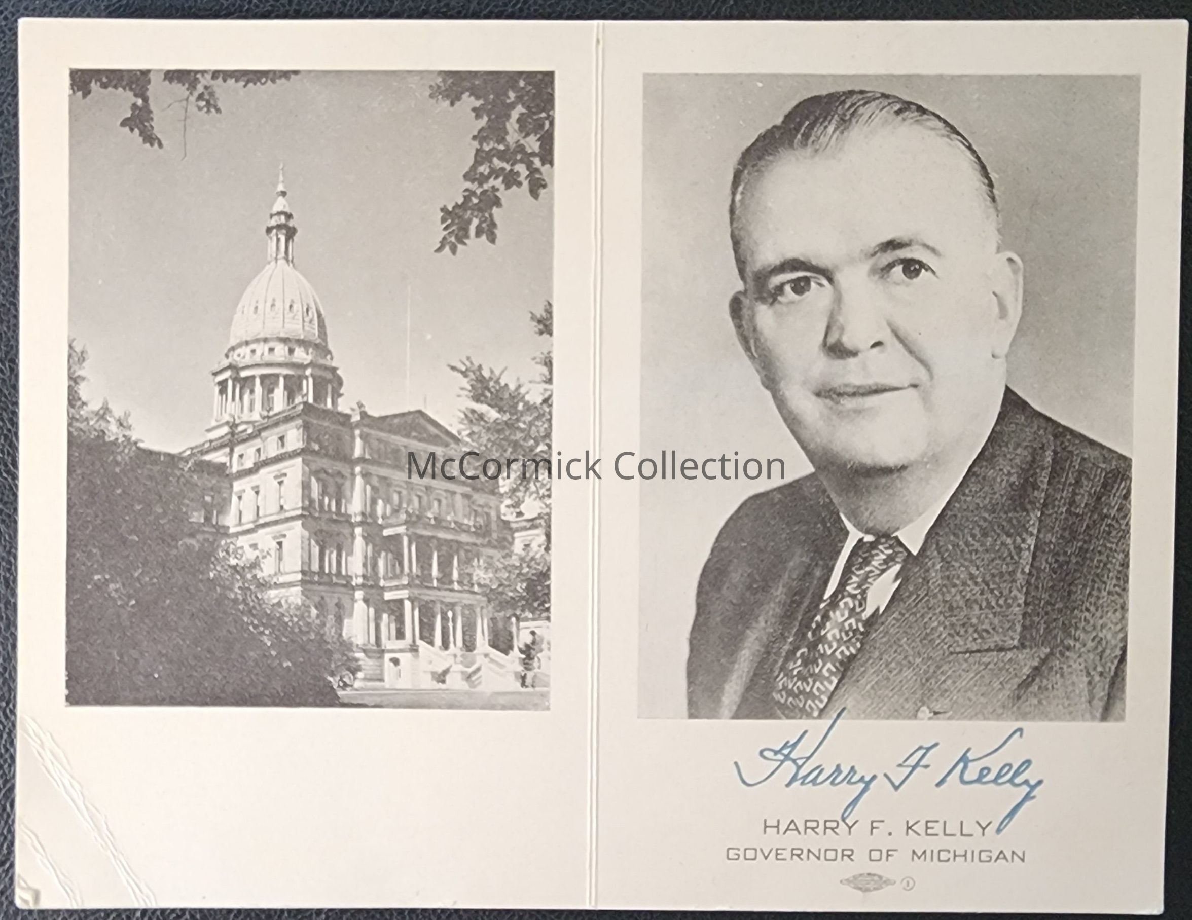 Signed card of Governor Harry F. Kelly of Michigan.
