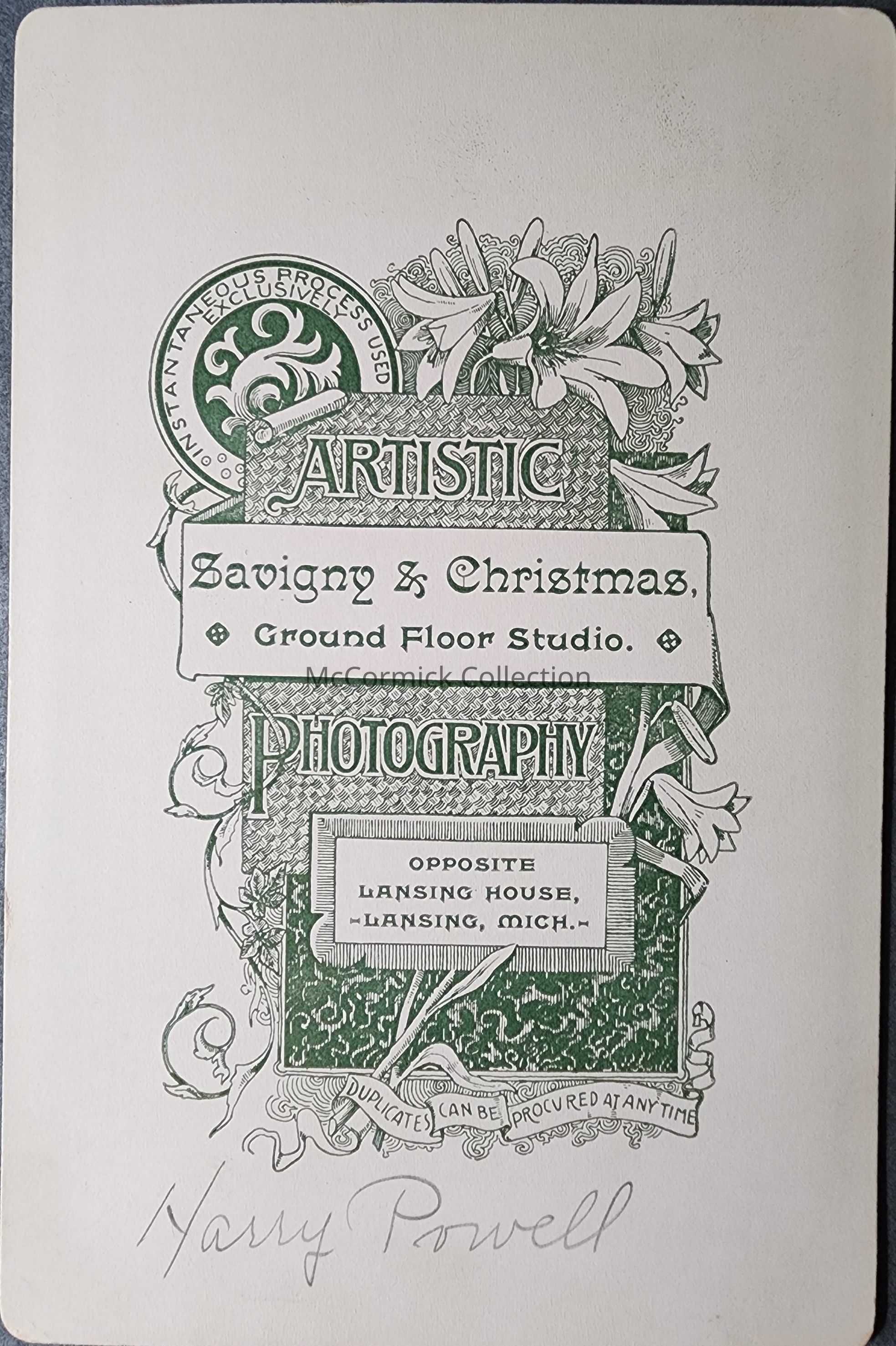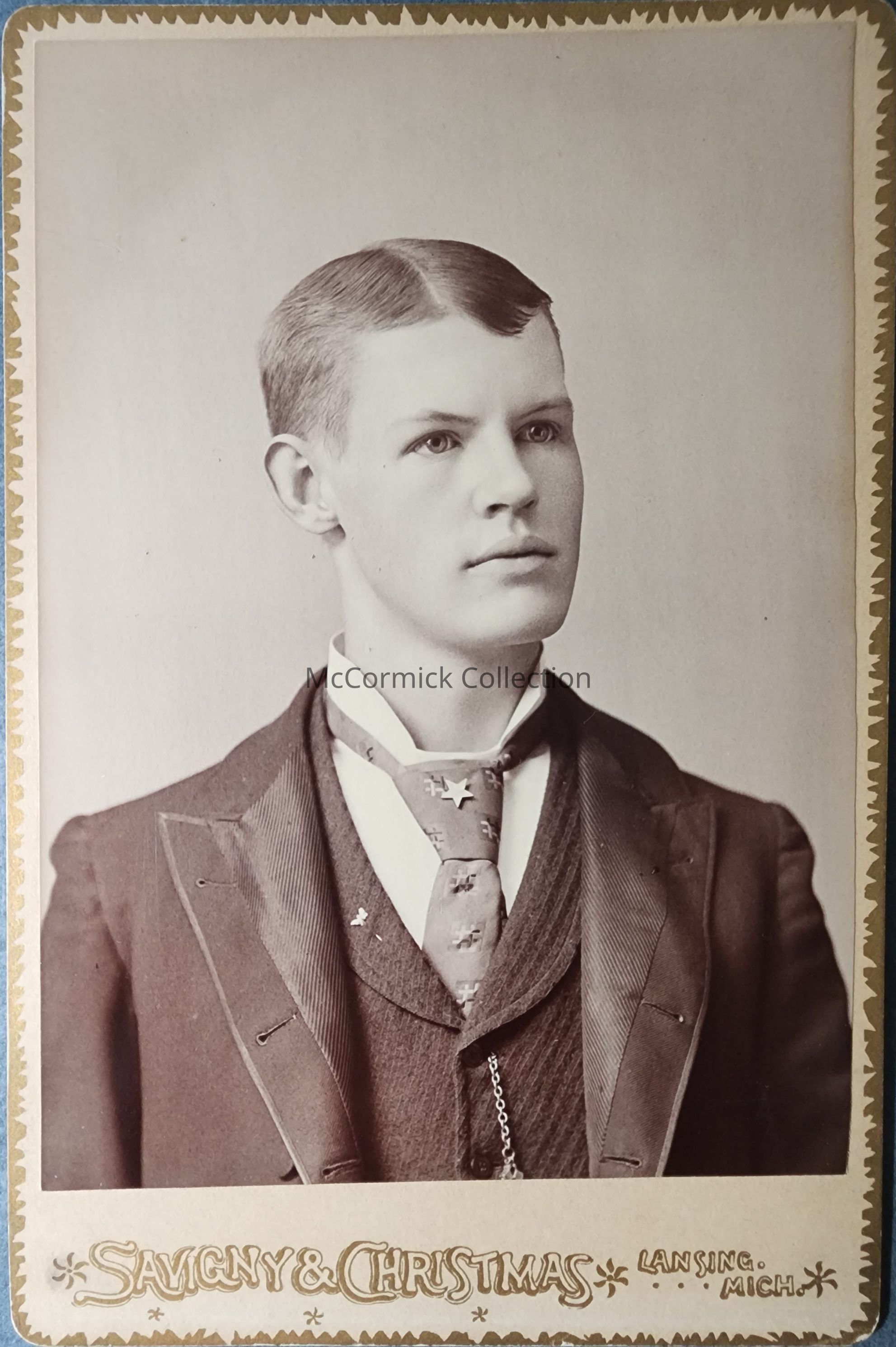 Cabinet card photograph of Harry Powell by Lansing photographer Savigny and Christmas. He wears star and butterfly pins.
