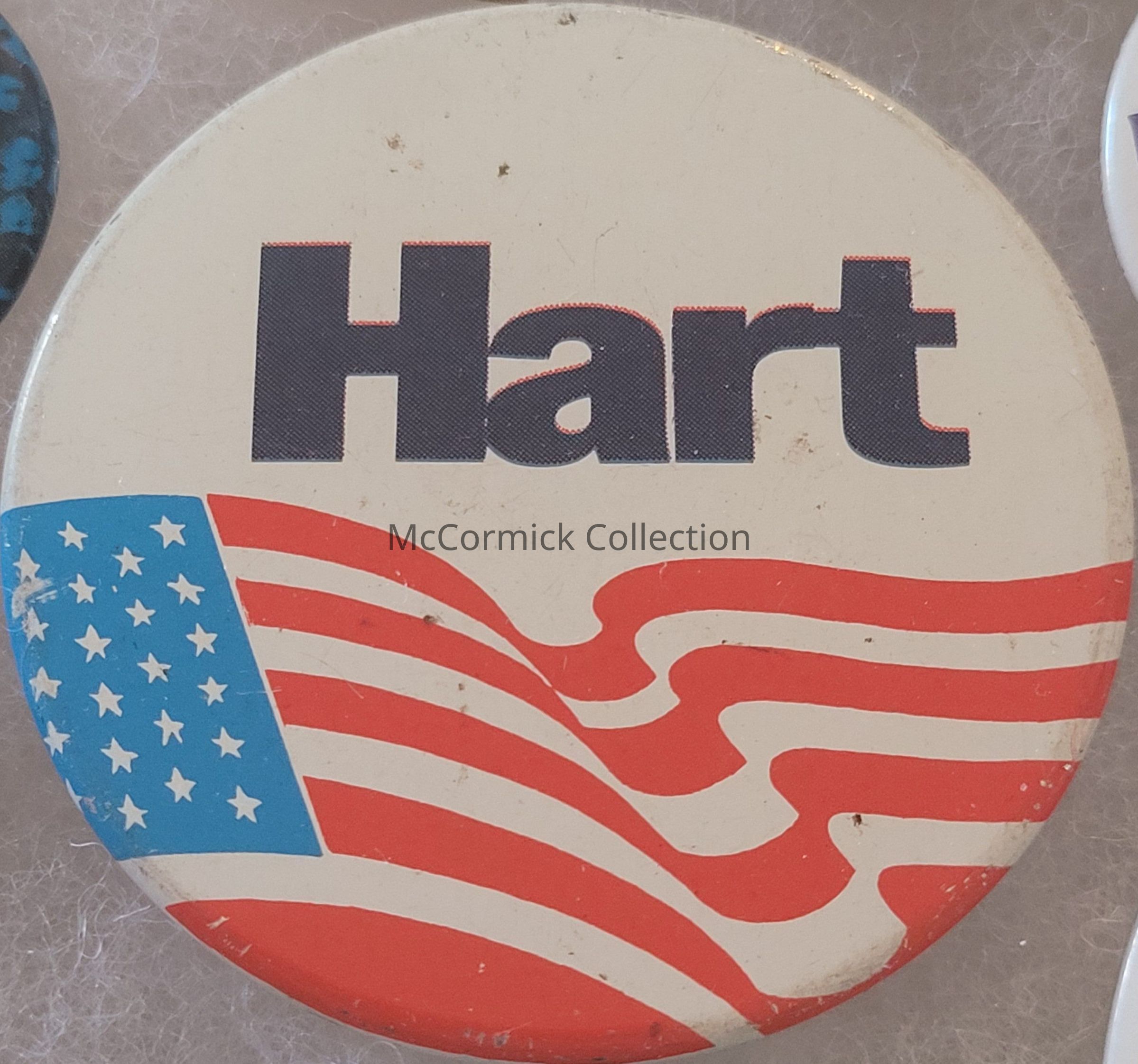 A 2.25" litho political button for Philip A. Hart for U.S. Senate with American Flag motif.