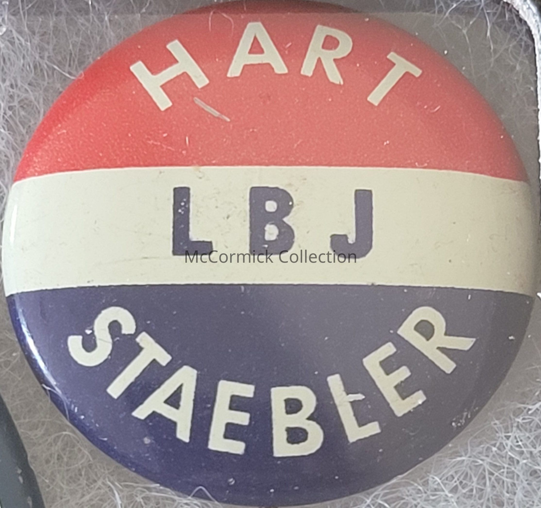 A 1" red, white, and blue political coattail button for Lyndon B. Johnson for President, Philip A. Hart for U.S. Senate, and Neil Staebler for Governor, 1964.